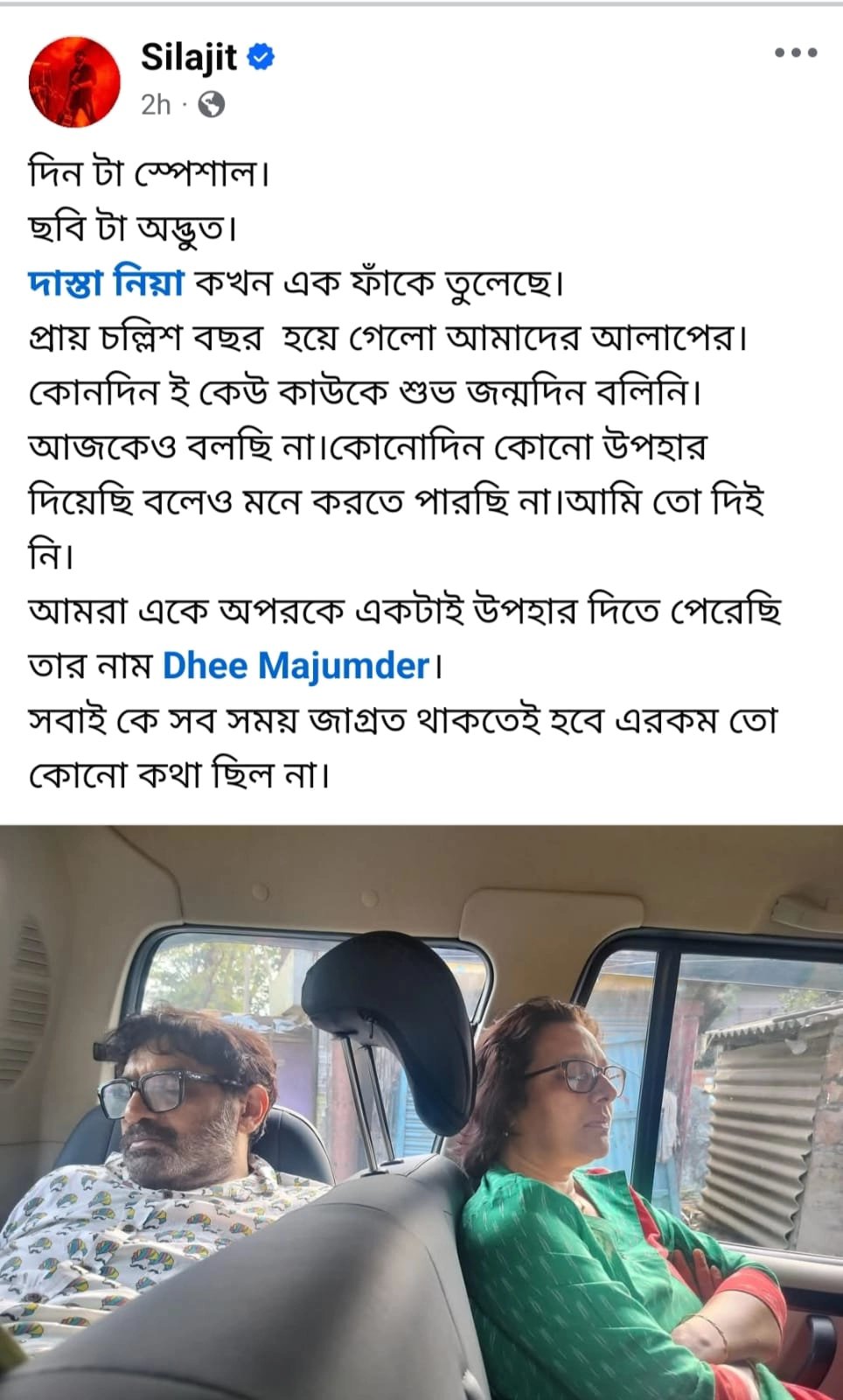 ফেসবুকে স্ত্রীয়ের সঙ্গে একটি ছবি পোস্ট করেছেন শিলাজিৎ। সেখানে মোটেও তাঁরা হাসিহাসি মুখ করে পরস্পরের পাশে বসে নেই। ছবিতে দেখা যাচ্ছে একটি গাড়ির সিটের দু'দিকে পরম নিশ্চিন্তে ঘুমোচ্ছেন তাঁরা। ইলিনা যতটা পরিপাটি, শিলাজিৎ সেই তুলনায় ঈষৎ অগোছালো। জানালার বাইরে তখন পর্যন্ত বিকেলের রোদ। এই ছবির সঙ্গে শিলাজিৎ লিখলেন,
