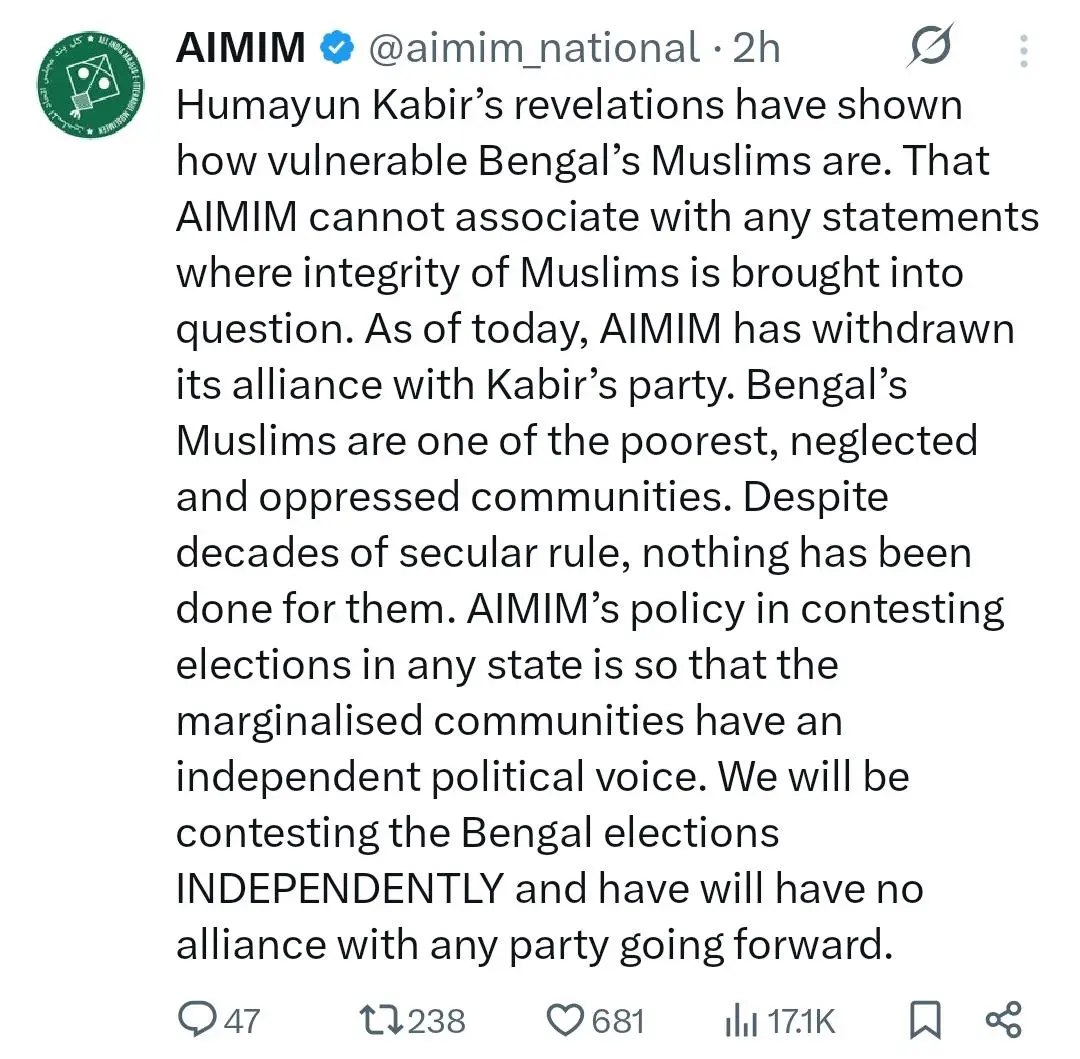যদিও দ্বিতীয় দফায় আসাদউদ্দিনের রাজ্য জুড়ে নির্বাচনী প্রচার শুরু হওয়ার আগেই হুমায়ুন কবীরের বিতর্কিত ভিডিওটি সমাজ মাধ্যমে ভাইরাল হয়ে গিয়েছে। আর এই ভিডিও দেখার পরই আসাদউদ্দিন নিজের সমাজ মাধ্যমের পাতায় হুমায়ুনের দলের সঙ্গে নির্বাচনী জোট ছিন্ন করার কথা ঘোষণা করে দিয়েছেন।