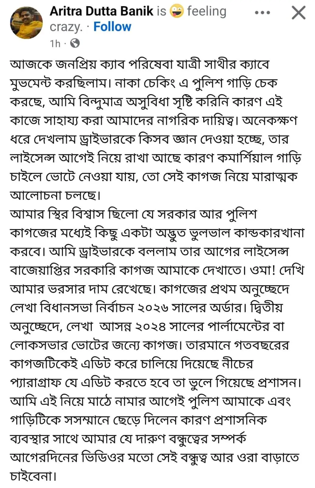 সম্প্রতি যাত্রীসাথী অ্যাপের এক ক্যাব চালকের গাড়ি রিকুইজিশনের একটি কাগজ ঘিরে এই শোরগোল শুরু হয়েছে। অরিজিৎ দত্ত বণিক নামে এক যাত্রী সমাজমাধ্যমে সেই কাগজের ছবি দিয়ে পুরো বিষয়টি তুলে ধরেছেন।