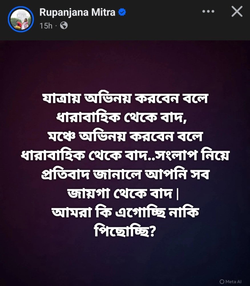 বর্তমানে ইন্ডাস্ট্রির এই পরিস্থিতি নিয়ে এবার সমাজমাধ্যমে মুখ খুললেন অভিনেত্রী রূপাঞ্জনা মিত্র। তিনি লেখেন, 'যাত্রায় অভিনয় করবেন বলে ধারাবাহিক থেকে বাদ, মঞ্চে অভিনয় করবেন বলে ধারাবাহিক থেকে বাদ..সংলাপ নিয়ে প্রতিবাদ জানালে আপনি সব জায়গা থেকে বাদ। আমরা কি এগোচ্ছি নাকি পিছোচ্ছি?'