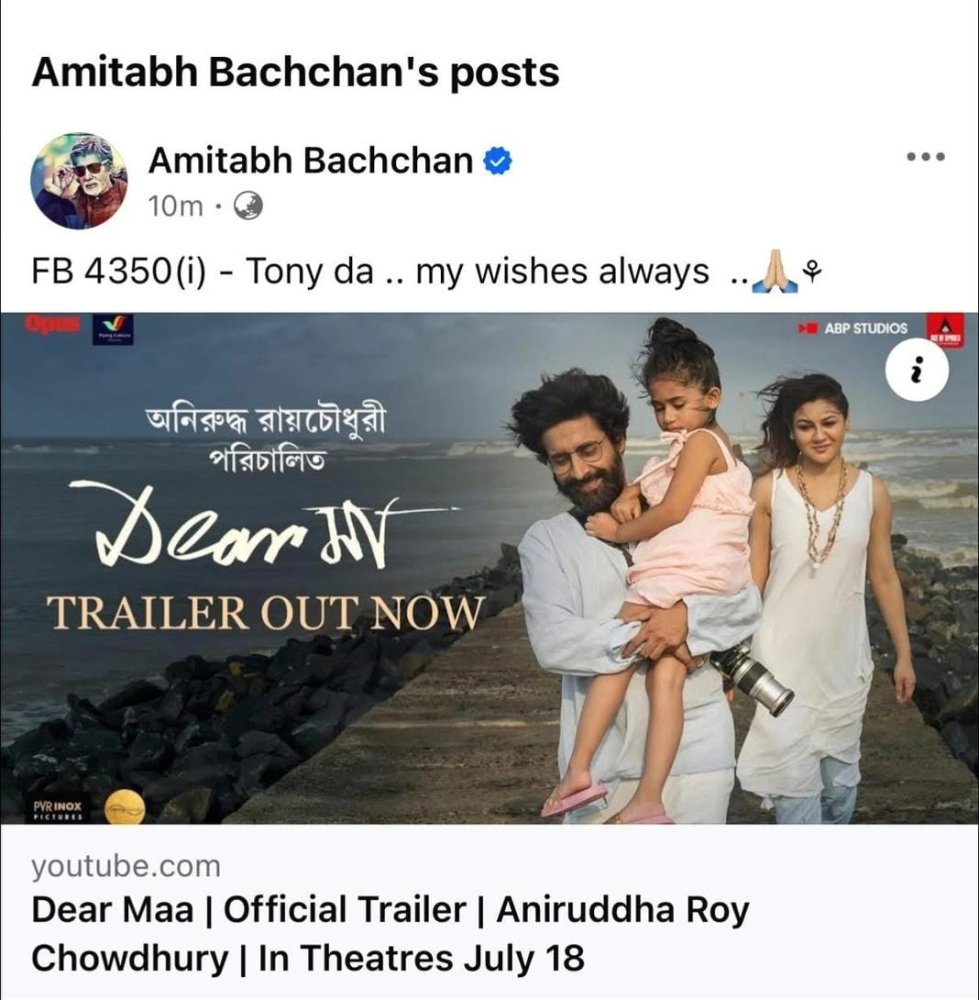 অনিরুদ্ধ রায় চৌধুরীর সঙ্গে ‘পিঙ্ক’ ছবিতে কাজ করেছেন অমিতাভ বচ্চন। একাধিকবার এই বাঙালি পরিচালকের কাজ নিয়ে প্রশংসা শোনা গিয়েছে ‘শাহেনশাহ’র মুখে। এবার অনিরুদ্ধের এই নতুন বাংলা ছবির ঝলক দেখে এক্স হ্যান্ডেলে অমিতাভ লেখেন, ‘‘টোনিদা, আপনার ছবির জন্য আমার শুভেচ্ছা সব সময় রয়েছে।’’ খোদ শাহেনশাহ র থেকে এহেন শুভেচ্ছা পেয়ে আপ্লুত ডিয়ার মা-র গোটা টিম।