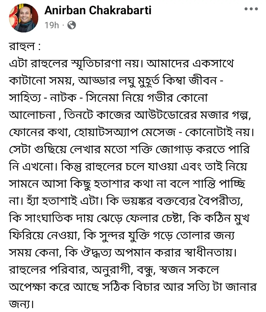 রাহুলের মৃত্যুর পর থেকে প্রযোজনা সংস্থা বা সংশ্লিষ্ট মহলের যে ধরণের বিবৃতি সামনে আসছে, তাকে ‘অপমান করার স্বাধীনতা’ এবং ‘ঔদ্ধত্য’ বলে আখ্যা দিয়েছেন অনির্বাণ। তাঁর মতে, রাহুলের পরিবার, অনুরাগী এবং বন্ধুরা কেবল সত্যিটা জানতে চায় এবং সঠিক বিচার চায়। কিন্তু তার বদলে যা মিলছে, তা হলো ধোঁয়াশা আর সত্যকে চাপা দেওয়ার এক মরিয়া চেষ্টা।