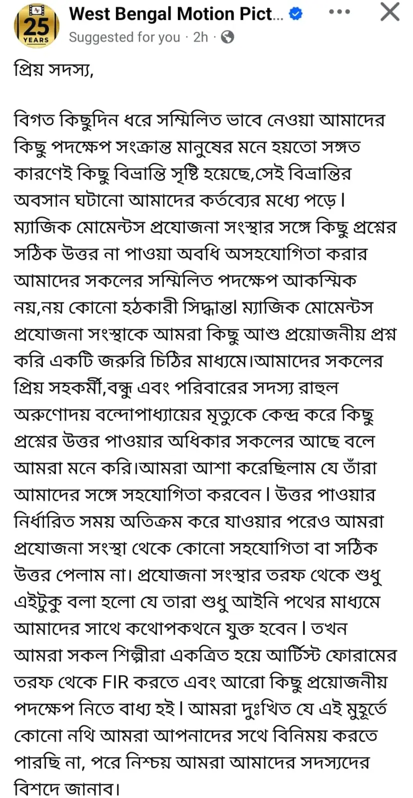 আর্টিস্ট ফোরামের সদস্যদের জন্য জারি করা এক বার্তায় জানানো হয়েছে, প্রয়াত অভিনেতা রাহুল অরুণোদয় বন্দ্যোপাধ্যায়ের মৃত্যু নিয়ে প্রযোজনা সংস্থা ‘ম্যাজিক মোমেন্টস’-এর কাছে কিছু জরুরি প্রশ্ন করা হয়েছিল। কিন্তু নির্ধারিত সময় পেরিয়ে গেলেও সংস্থা কোনও সদুত্তর দেয়নি। উল্টে তারা শুধু আইনি পথে কথা বলার কথা জানিয়েছে।প্রযোজনা সংস্থার এই অনমনীয় মনোভাব দেখে ফোরামের সদস্যরা একত্রিত হয়ে বড় সিদ্ধান্ত নিয়েছেন। রাহুলের মৃত্যুর কারণ এবং পারিপার্শ্বিক পরিস্থিতি খতিয়ে দেখতে পুলিশের কাছে এফআইআর দায়ের করা হয়েছে। শিল্পীরা জানিয়েছেন, এটি কোনও হঠকারী সিদ্ধান্ত নয়, বরং বন্ধু ও সহকর্মীর বিচার পাওয়ার লড়াই।