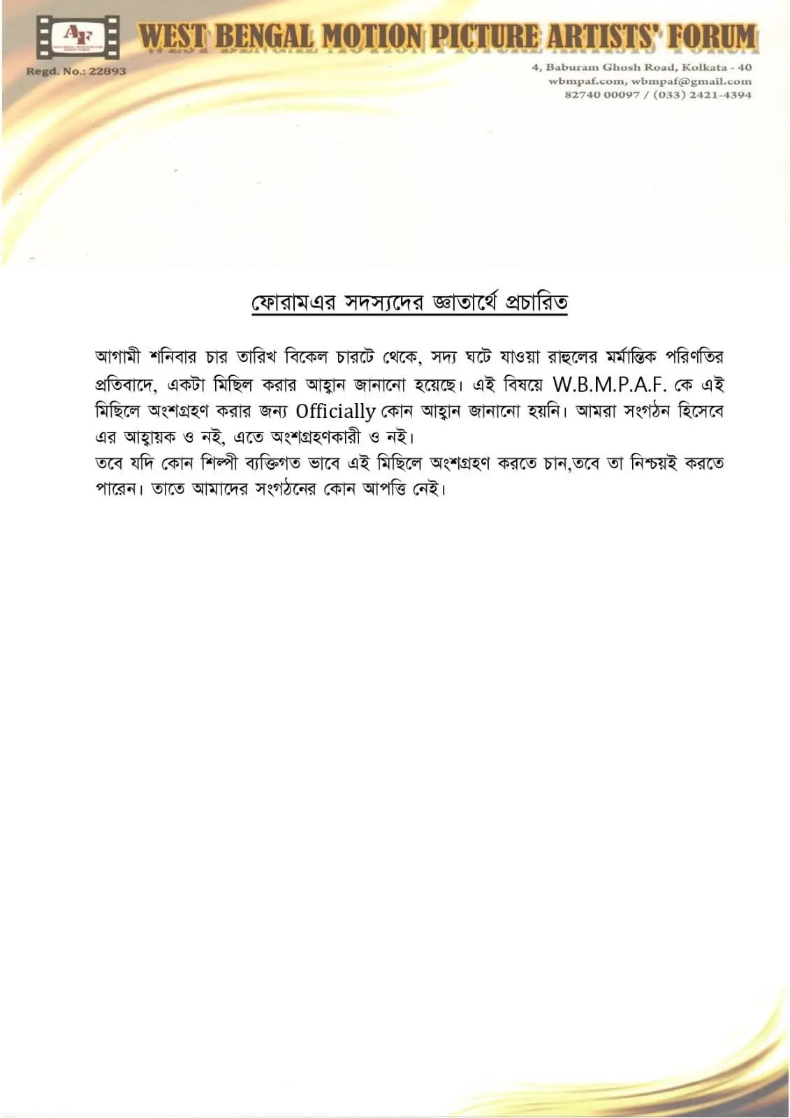 আর্টিস্ট ফোরামের পক্ষ থেকে প্রথমে একটি কড়া চিঠি পাঠিয়ে প্রযোজনা সংস্থার কাছে কৈফিয়ত চাওয়া হয়েছিল। কেন চিত্রনাট্যের বাইরে গিয়ে বিপজ্জনক শ্যুটিং করা হলো, সেই প্রশ্নও তুলেছিল তারা। কিন্তু শনিবারের প্রতিবাদ মিছিল নিয়ে ফোরামের সাম্প্রতিকতম বিবৃতি টলিপাড়াকে চমকে দিয়েছে। ফোরাম স্পষ্ট জানিয়েছে, এই মিছিলের জন্য তাদের আনুষ্ঠানিকভাবে কোনও আমন্ত্রণ জানানো হয়নি। তারা এই মিছিলের আহ্বায়কও নয়, এমনকি অংশগ্রহণকারীও নয়। তবে কোনও শিল্পী ব্যক্তিগতভাবে চাইলে মিছিলে যেতে পারেন।