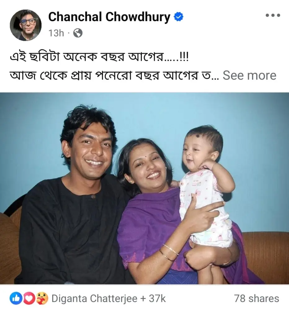 স্ত্রীর সঙ্গে নিজের বহু বছর আগের তোলা একটি ছবি পোস্ট করেছেন চঞ্চল। সেই ছবিতে দেখা যাচ্ছে তাঁদের সন্তান শুদ্ধ-কেও। যদিও শুদ্ধ তখন একরত্তি। সেই ফেসবুক পোস্টে চঞ্চল লিখলেন -