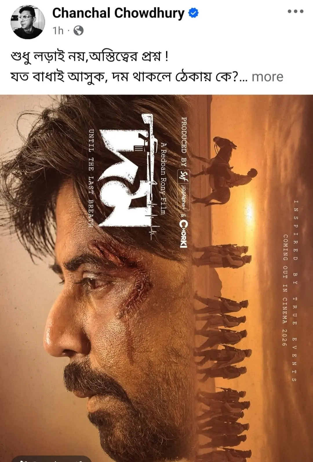 সামাজিক মাধ্যমে পোস্টারটি শেয়ার করে অভিনেতা চঞ্চল চৌধুরী লিখেছেন, “শুধু লড়াই নয়, অস্তিত্বের প্রশ্ন! যত বাধাই আসুক, দম থাকলে ঠেকায় কে?” তার এই মন্তব্যই যেন ছবির আবহকে আরও তীব্র করে তুলেছে।