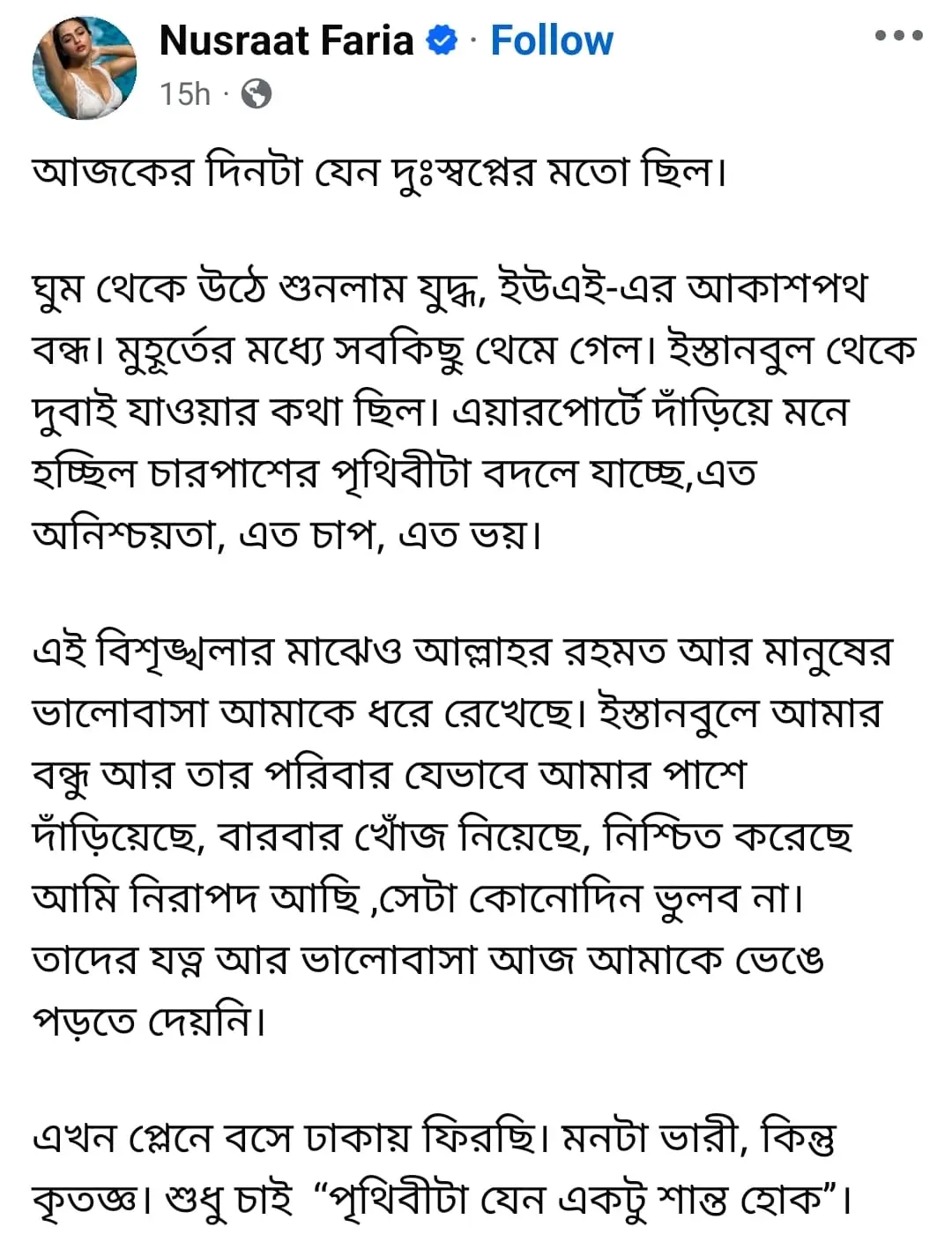 তিনি লেখেন,“ঘুম থেকে উঠে শুনলাম যুদ্ধের পরিস্থিতি, আর সংযুক্ত আরব আমিরশাহির আকাশপথ বন্ধ। মুহূর্তে সব থেমে গেল। আমার ইস্তানবুল থেকে দুবাই যাওয়ার কথা ছিল। বিমানবন্দরে দাঁড়িয়ে মনে হচ্ছিল চারপাশের পৃথিবী বদলে যাচ্ছে। এত অনিশ্চয়তা, এত চাপ, এত ভয়।”