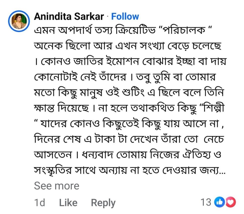স্বভাবতই বিষয়টি নেটপাড়ার একটি বড় অংশ ভাল চোখে নেয়নি। ওই অবাঙালি পরিচালককে ‘অপদার্থ’ যেমন বলা হয়েছে তেমনই অভিনেতার প্রশ্নগশা করে তাঁর উদ্দেশ্যে লেখা হয়েছে – “…তবু তুমি বা তোমার মতো কিছু মানুষ ওই শুটিংয়ে ছিলে বলে তিনি ক্ষান্ত দিয়েছে। না হলে তথাকথিত কিছু শিল্পী যাদের কোনও কিছুতেই কিছু যায় আসে না, দিনের শেষে এ টাকাটা দেখেন তাঁরা তো নেচে আসতেন। ধন্যবাদ তোমাকে, নিজের ঐতিহ্য ও সংস্কৃতির সঙ্গে অন্যায় না হতে দেওয়ার জন্য।”