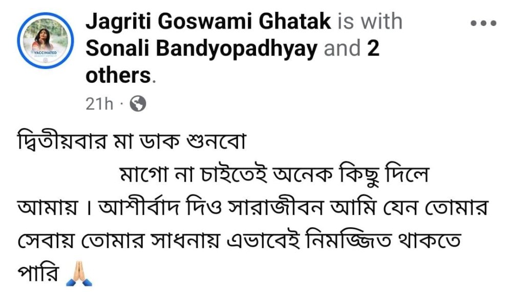 পোস্টে তিনি এক শিল্পকর্মের মাধ্যমে মাতৃত্ব ও শক্তির প্রতীকী চিত্রও ভাগ করে নেন। সেখানে মায়ের কোলে শিশু, পাশে দাঁড়িয়ে বড় মেয়ে— যেন নারীর শক্তির তিন রূপ একসঙ্গে মিলেছে। জাগৃতির কথায়, “প্রতিটি নারী, প্রতিটি কন্যা অন্তরে বহন করে দুর্গার শক্তি। তিনি মা রূপে লালন করতে পারেন, কন্যা রূপে দিশা দিতে পারেন, স্ত্রী রূপে ভালবাসতে পারেন, বন্ধু রূপে সহায় হতে পারেন, আবার নেতা রূপে এগিয়ে আসতে পারেন। তিনিই শক্তি।”