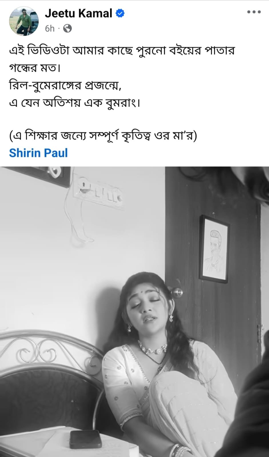 জিতু আরও লিখেছিলেন, “সত্যি বলছি। ডিরেক্টরকে খুব একটা বেশি খাটতে হবে না। খুব তাড়াতাড়ি ধরে নিতে পারে কাজ। খুব তাড়াতাড়ি বুঝতে পারে। আর বিবেক-শিক্ষিতা তো,তাই জন্য ওর মধ্যে একটা বিবেক কাজ করে, যে কতটুকু আমি শুনবো আর কতটুকু শুনবো না। খুব সুন্দর হবে আমাদের কাজ এই আশা রাখি। এটাও জানি,আপনারা পাশে ছিলেন এবং পাশে থাকবেন।নতুন শুরু করেছে তাকে উৎসাহিত করবেন। নীচে টেনে নামানোর চেষ্টায় ওর মন ভেঙে দেবেন না।কিছু কিছু মানুষ তবুও করবেন তাঁদেরকে আর কী বলব বলুন। তারা তাদের কাজ করে যাবেন, আমরা আমাদের কাজটুকু করি। জয় মহাকাল।”