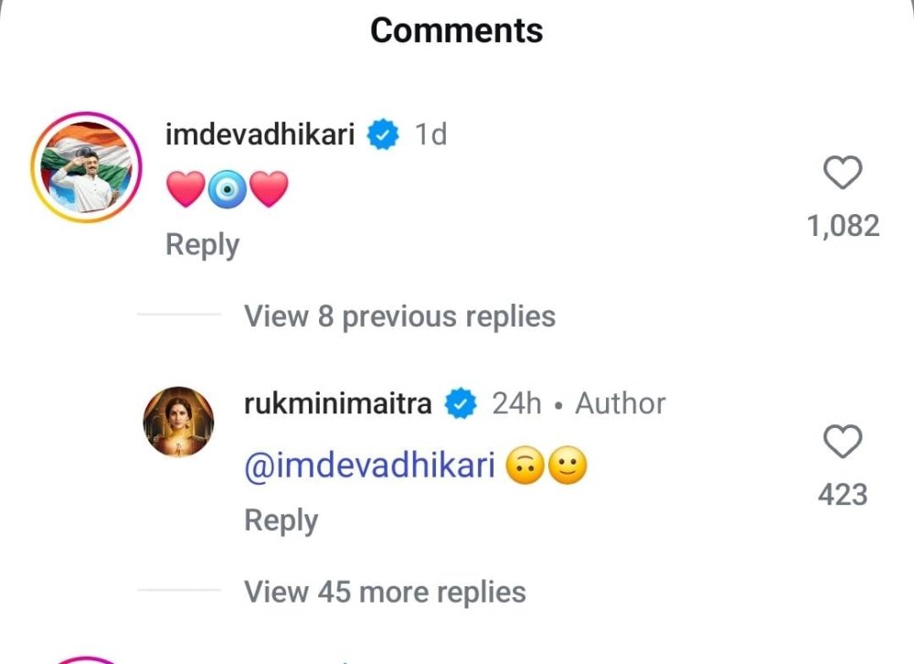 সম্প্রতি ইনস্টাগ্রামে একটি ছবি পোস্ট করেছেন রুক্মিণী। সোনালি রঙের শাড়িতে সেজে উঠেছেন নায়িকা। গায়ে মানানসই গয়না। হালকা মেকআপ। মুখে হাসি। সহজ সাজে সুন্দরী পর্দার বিনোদিনী। অনুরাগীরা ভালবাসায় ভরিয়ে দিয়েছেন তাঁকে। প্রেম প্রকাশ করেছেন তাঁর মনের মানুষও। রুক্মিণীর ছবিতে হার্ট এবং খারাপ নজরকে প্রতিহত করার ইমোজি দিয়েছেন দেব। যেন কিছু না বলেই বলে দিতে চাইছেন, তাঁদের প্রেমে নজর যেন না লাগে। উত্তর দিয়েছেন রুক্মিণীও। তবে প্রেমিককে প্রেম থুড়ি প্রেমের ইমোজি ফিরিয়ে দেননি তিনি। দুটো হাসি মুখের ইমোজি দিয়েই ইতি টেনেছেন।