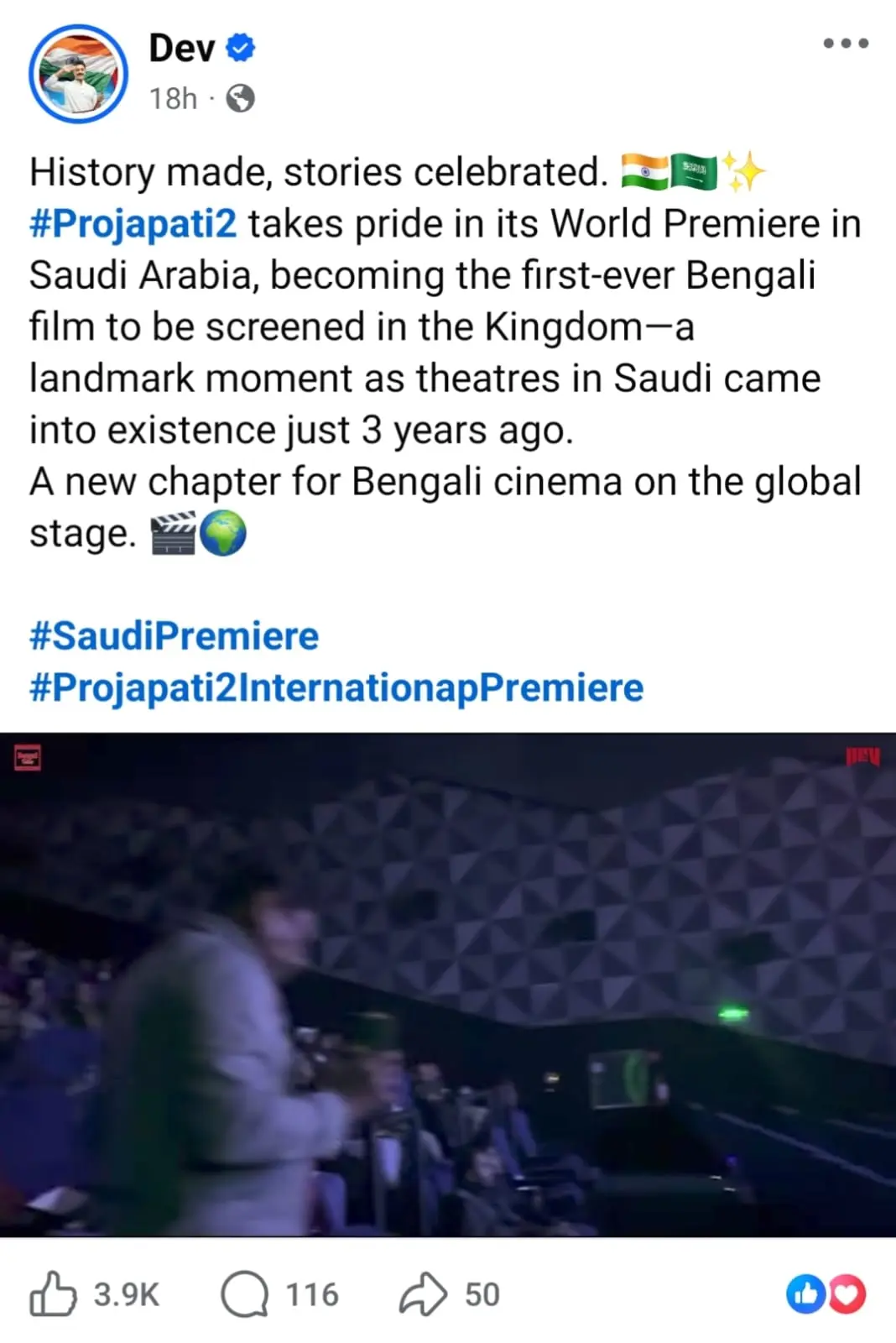 উল্লেখযোগ্য বিষয়, সৌদি আরবে সিনেমা হলের যাত্রা শুরু হয়েছে মাত্র তিন বছর আগে। সেই সদ্য-গড়ে-ওঠা প্রেক্ষাগৃহেই প্রথমবারের মতো জায়গা করে নিল একটি বাংলা ছবি, যা নিঃসন্দেহে শুধু একটি ছবির সাফল্য নয়, বরং বাংলা সিনেমার জন্য এক ঐতিহাসিক মুহূর্ত। গোটা বিষয়টি একটি ছোট্ট ভিডিওর সঙ্গে পোস্ট করে ফেসবুকে লিখলেন দেব।
