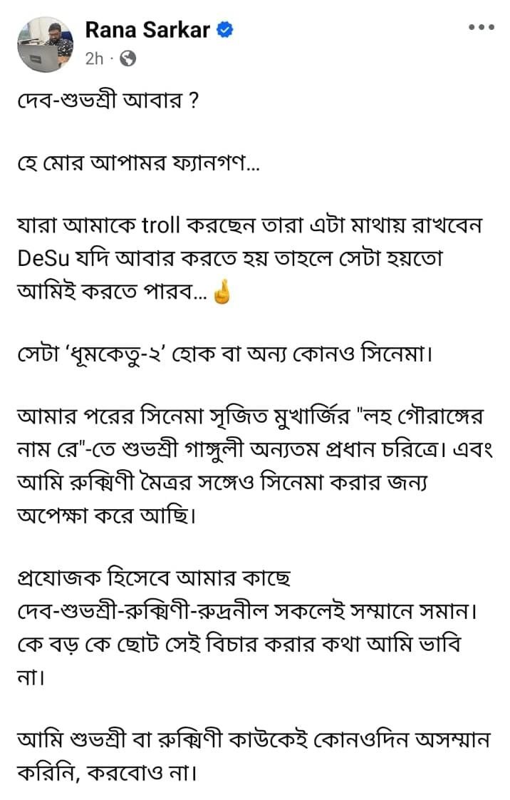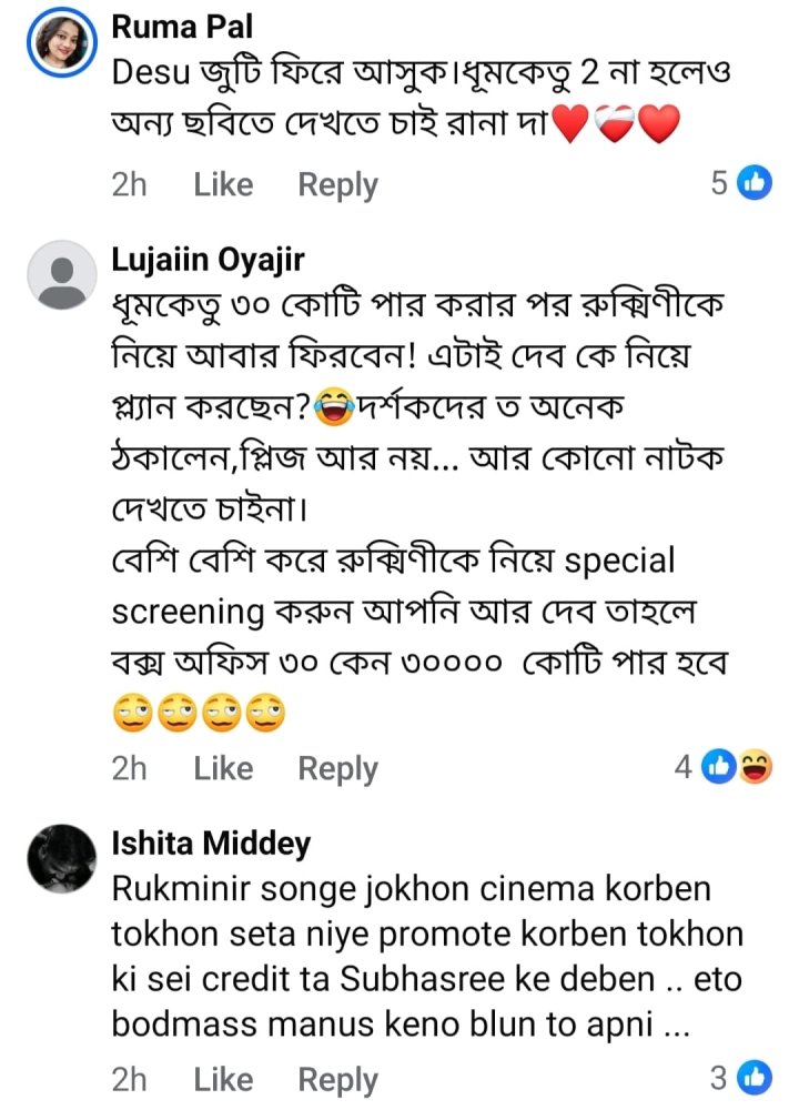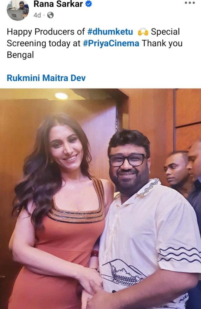 ‘ধূমকেতু’ বক্স অফিসে সফল হতেই ফের বিতর্কে প্রযোজক রাণা সরকার। বিতর্কের উপলক্ষ্য? সেই দেব-শুভশ্রী এবং রুক্মিণী! শুরু থেকেই শুরু করা যাক। সম্প্রতি, ‘ধূমকেতু’-র একটি বিশেষ প্রদর্শনীতে দেবের পাশাপাশি হাজির হয়েছিলেন রুক্মিণী মৈত্র। সেখানে ছিলেন না শুভশ্রী। সেই অনুষ্ঠান শেষে রুক্মিণীর সঙ্গে একটি ছবি তুলে সমাজমাধ্যমে পোস্ট করেন রাণা। ছবির ক্যাপশনে লেখেন, ‘ধূমকেতু’র প্রযোজকেরা'।