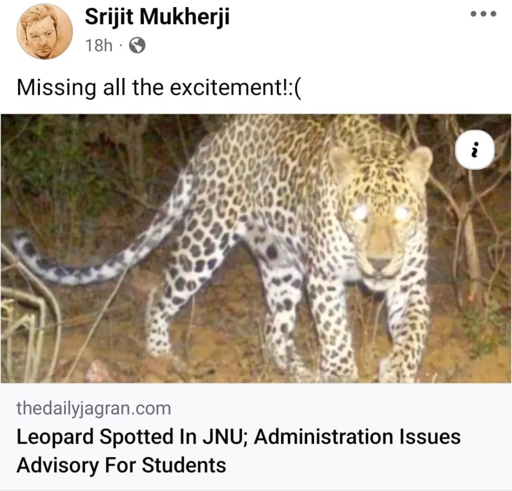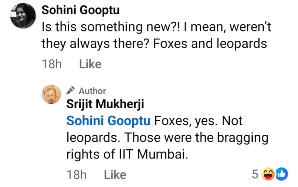 যাই হোক, ফেরা যাক সৃজিতীয় প্রসঙ্গে। পোস্টের বার্তা বাক্সে একজন মন্তব্য করেন – “এটা কী নতুন ব্যাপার নাকি? মানে, শেয়াল-চিতাবাঘেদের তো সবসময়ই জেএনইউ চত্বরে দেখা যায়।” পাল্টা সৃজিতের জবাব – “ওই চত্বরে শেয়াল দেখা যায় নিশ্চয়ই। কিন্তু চিতাবাঘ নয়। ওটা আইআইটি মুম্বইয়ের গর্ব করার বিষয়!”