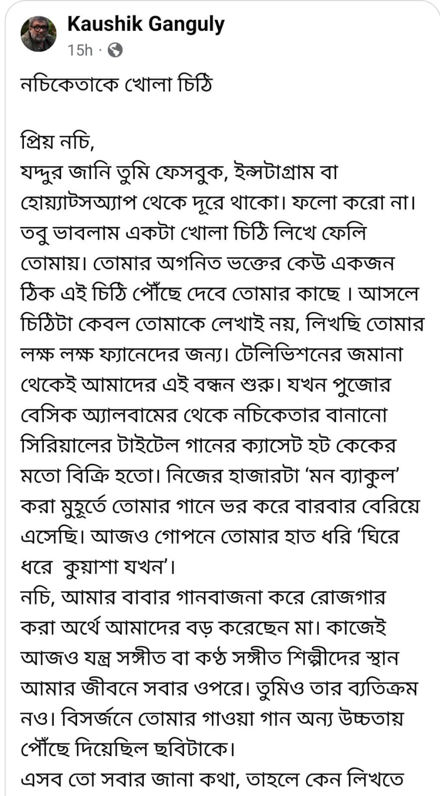 যদ্দুর জানি তুমি ফেসবুক, ইন্সটাগ্রাম বা হোয়্যাট্সঅ্যাপ থেকে দূরে থাকো। ফলো করো না। তবু ভাবলাম একটা খোলা চিঠি লিখে ফেলি তোমায়। তোমার অগনিত ভক্তের কেউ একজন ঠিক এই চিঠি পৌঁছে দেবে তোমার কাছে। আসলে চিঠিটা কেবল তোমাকে লেখাই নয়, লিখছি তোমার লক্ষ লক্ষ ফ্যানেদের জন্য। টেলিভিশনের জমানা থেকেই আমাদের এই বন্ধন শুরু। যখন পুজোর বেসিক অ্যালবামের থেকে নচিকেতার বানানো সিরিয়ালের টাইটেল গানের ক্যাসেট হট কেকের মতো বিক্রি হতো। নিজের হাজারটা ‘মন ব্যাকুল’ করা মুহূর্তে তোমার গানে ভর করে বারবার বেরিয়ে এসেছি। আজও গোপনে তোমার হাত ধরি ‘ঘিরে ধরে  কুয়াশা যখন’।