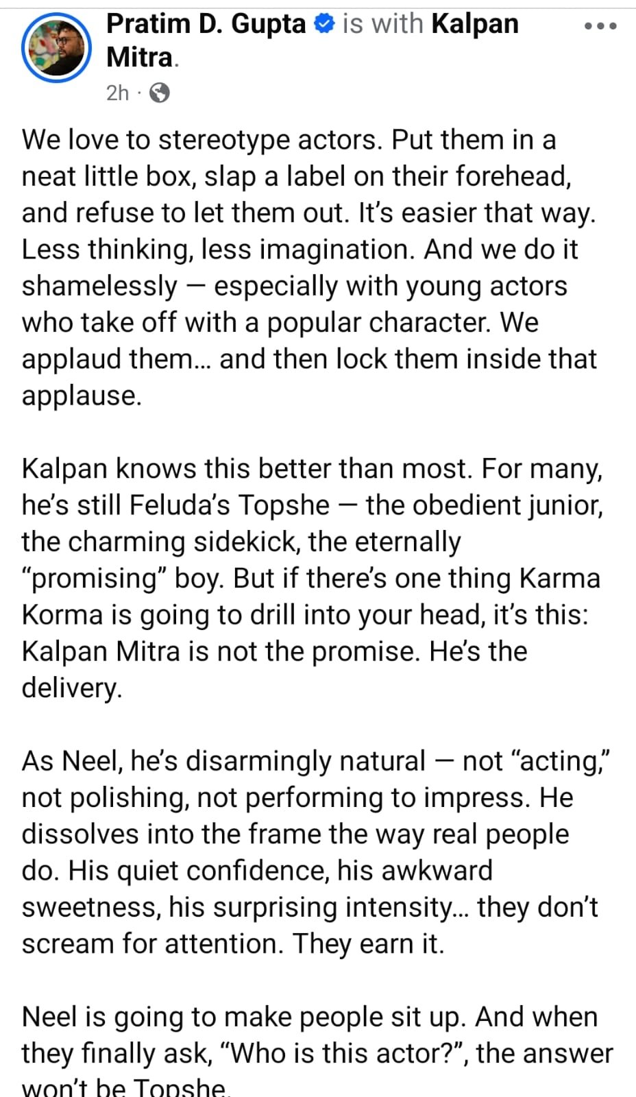 পরিচালকের তরফে এহেন প্রশংসা পেয়ে আপ্লুত কল্পন। তিনি পাল্টা লেখেন, “এই কৃতজ্ঞতা প্রকাশ করার মতো শব্দ হয়তো আমার কাছে ঠিকঠাক গুছিয়ে নেই। তবু সরল ভাবে, একেবারে খোলাখুলি বলতেই চাই, ধন্যবাদ। প্রতিম ডি. গুপ্ত, নীলের জুতোটায় আমাকে পা রাখতে দেওয়ার জন্য ধন্যবাদ। শুরুর মুহূর্ত থেকেই আমাকে বিশ্বাস করার জন্য, আর কাজটা জুড়ে পাশে দাঁড়ানোর জন্য। আপনার সেই ভরসাটাই আমার কাছে সবচেয়ে মূল্যবান।”