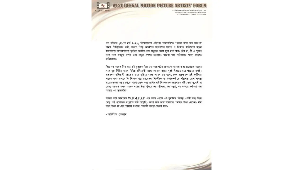 আর্টিস্ট ফোরাম ধারাবাহিকের প্রযোজনা সংস্থা ম্যাজিক মোমেন্টসকে চিঠি দিয়েছে। সেই বিবৃতিতে লেখা হয়, "গত কয়েক দিন ধরে যে সমস্ত ঘটনা প্রকাশ্যে আসছে এবং প্রযোজক সংস্থার সঙ্গে যুক্ত বিভিন্ন মানুষ স্ববিরোধী মন্তব্য করছেন তাতে খুবই দ্বিধাগ্রস্ত হয়ে পড়ছে সবাই। আসল প্রশ্ন, রাহুলকে কেন এই দুর্ঘটনায় পড়তে হল? প্রযোজকদের তরফে কি আগে থেকে কোনও শিল্পীকে বাঁচানোর ব্যবস্থা করা হয়নি? এই বিপদজনক জায়গায় শুটিং করা হল কেন? আমরা স্বচ্ছ উত্তর চেয়ে চিঠি দিয়েছি। আশা করি যথাযথ উত্তর দেবেন। যদি উত্তর না দেন, তাহলে যথাযথ ব্যবস্থা নেওয়া হবে।"