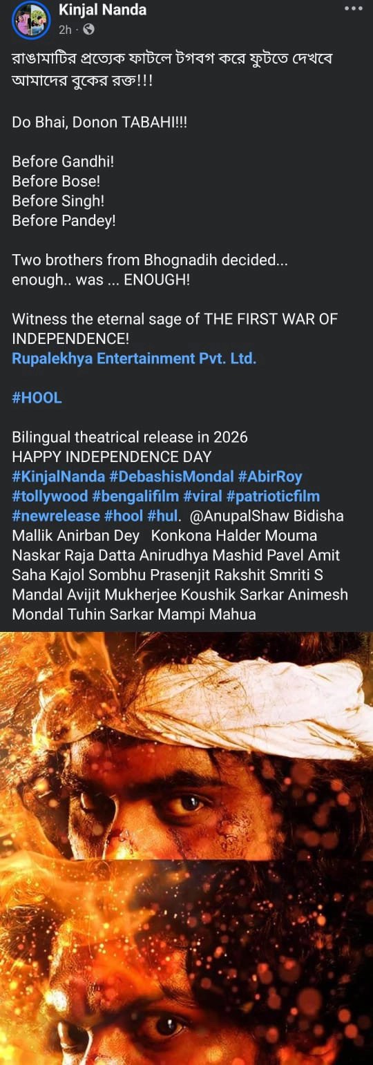 এর আগে হুল দিবসের দিন ছবির প্রথম পোস্টার ভাগ করে কিঞ্জল লিখেছিলেন, 'পাহাড়ে জঙ্গলে ঘেরা ছোট্ট একটা গ্রাম ভোগনাডিহি। সেখানকার দুই অসীম সাহসী সাঁওতাল ভাই নিজেদের বাকি চার ভাই বোনকে সাথে করে গোটা আদিবাসী সমাজকে একত্র করে যুগ যুগ ধরে হয়ে আসা অন্যায় অত্যাচার আর সামাজিক শোষণের বিরুদ্ধে যে মহা বিদ্রোহের ডাক দেয়, তা যেন বীজ বপন করে আগামী দিনের দেশ স্বাধীন করার সমস্ত মহা সংগ্রামের! হাজার হাজার আদিবাসী বিদ্রোহী মাটির লড়াইয়ে শহীদ হন! প্রথমবার বড় পর্দায় আসতে চলেছে সেই মহা গাথা!