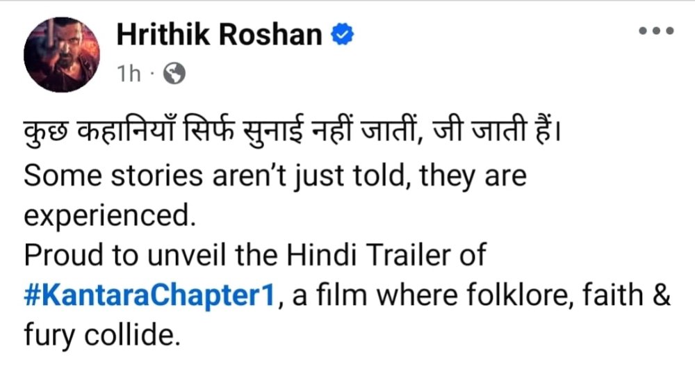 এই ছবির ট্রেলার উন্মোচন করে হৃতিক লিখলেন, “কিছু গল্প শুধু বলার মধ্যেই শেষ হয় না, তাকে অনুভব করতে হয়। ‘কান্তারা চ্যাপ্টার ১’-এর হিন্দি ভার্সনের ট্রেলারের ভিডিও আপনাদের সঙ্গে ভাগ করে নিতে পেরে আমি যারপরনাই গর্বিত।”