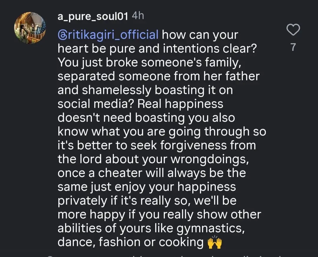 যদিও ঋত্বিকার এই পোস্টে মন ভেজেনি নেটপাড়ার সব বাসিন্দাদের। তাই তো একজন রাখঢাক না করেই হিরণের দ্বিতীয় স্ত্রীর উদ্দেশ্যে মন্তব্য করলেন, “আচ্ছা কী করে আপনার হৃদয় স্বচ্ছ এবং চিন্তাভাবনা পরিষ্কার থাকে বলুন তো? কারণ আপনি একজনের পরিবার ভেঙেছেন, এক সন্তানকে তার বাবার থেকে আলাদা করে দিয়েছেন আর তারপরেও সেই ব্যাপারটা নির্লজ্জের মতো সমাজমাধ্যমে ফলাও করে বলছেন? শুনুন, সত্যিকারের আনন্দ কিন্তু ফলাও করে দেখতে হয় না। আপনি নিজেও জানেন এইমুহূর্তে আপনার পরিস্থিতিটি ঠিক কী। তাই সবথেকে ভাল হয়, যদি একবার যে ঈশ্বরের কাছে নিজের করা ভুলভাল কাজের জন্য ক্ষমা চান। আর একটা কথা, যে একবার ঠকায় সে কিন্তু বারবারই ঠকায়। তাই নিজের আনন্দ ব্যক্তিগত পরিসরেই উদ্যাপন করুন। আর এসব না দেখিয়ে নিজের গুণগুলো বরং সমাজমাধ্যমে ভাগ করে নিন।”