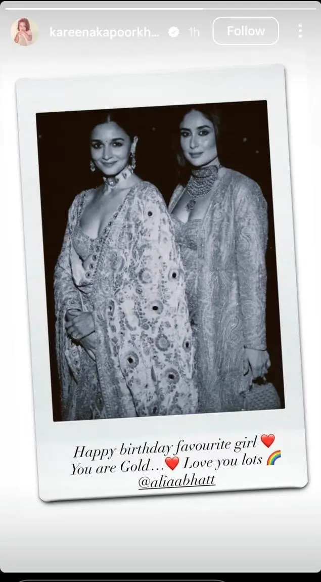 রবিবার করিনা তাঁর ইনস্টাগ্রাম স্টোরিতে আলিয়াকে জন্মদিনের শুভেচ্ছা জানিয়ে একটি পোস্ট করেন। সেখানে তাঁদের দুজনকেই সাবেকি পোশাকে দেখা যাচ্ছে। এই ছবিটির সঙ্গে বেবো যে বার্তাটি লিখেছেন আলিয়ার জন্য সেটা সকলের মন জয় করে নিয়েছে।
