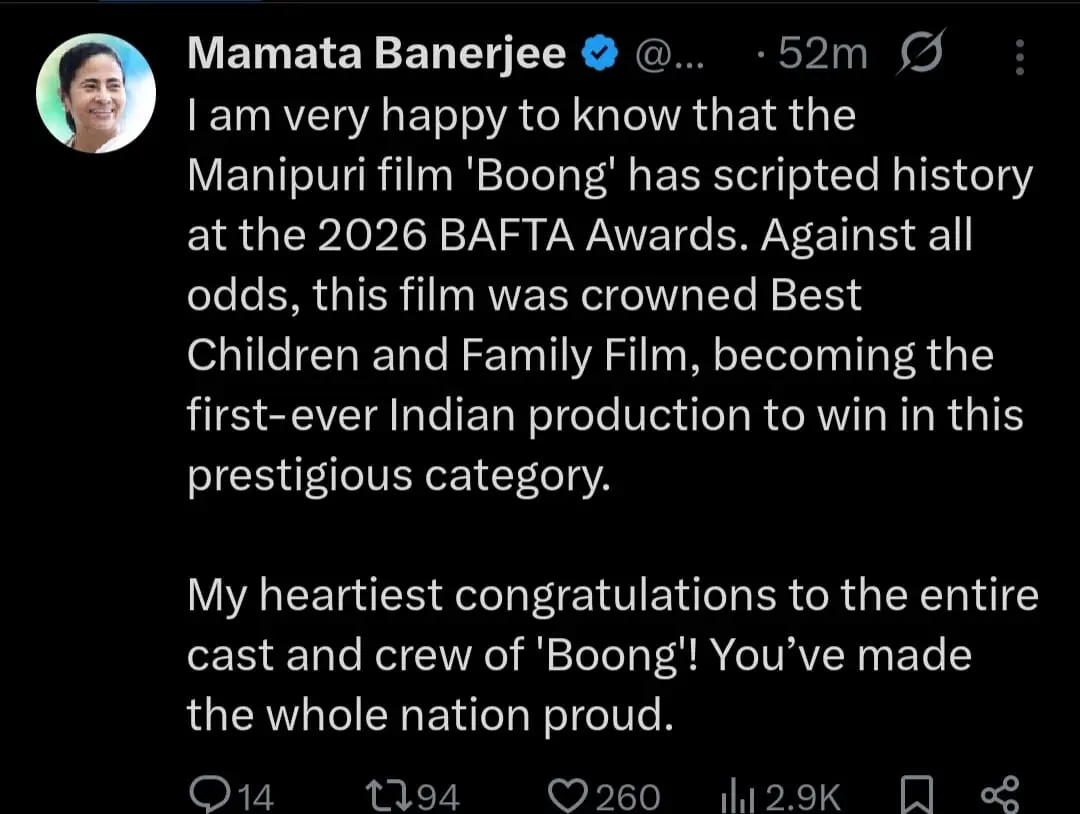এই ঐতিহাসিক সাফল্যে শুভেচ্ছা জানান বাংলার মুখ্যমন্ত্রী মমতা ব্যানার্জি। সমাজমাধ্যমে তিনি লেখেন, “২০২৬ সালের বাফটা-য় ‘বুং’-এর জয় ভারতীয় সিনেমার ইতিহাসে এক নতুন অধ্যায়।” প্রতিকূলতা পেরিয়ে এই ছবির সেরা শিশু ও পারিবারিক ছবির সম্মান পাওয়া গোটা দেশের গর্বের মুহূর্ত বলেই মন্তব্য করেন তিনি। মুখ্যমন্ত্রী আরও লেখেন, “প্রথমবার কোনও ভারতীয় ছবি এই বিভাগে পুরস্কার জয় করেছে। গোটা টিমকে আমার আন্তরিক অভিনন্দন। বিশ্বের মঞ্চে আপনারা দেশকে গর্বিত করেছেন।”
