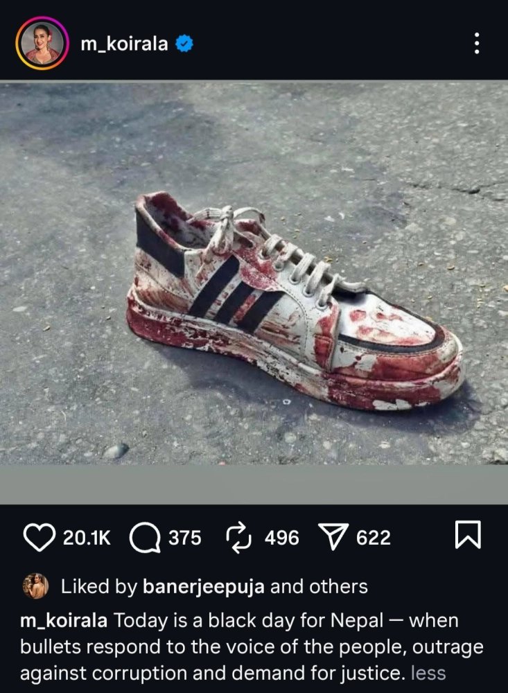 কিন্তু গ্ল্যামারের বাইরেও দেশের সংকট তাঁকে গভীরভাবে নাড়া দিয়েছে। রক্তমাখা জুতোর ছবির সঙ্গে তাঁর বার্তা এখন নেপালের তরুণ আন্দোলনের প্রতীক হয়ে উঠেছে।