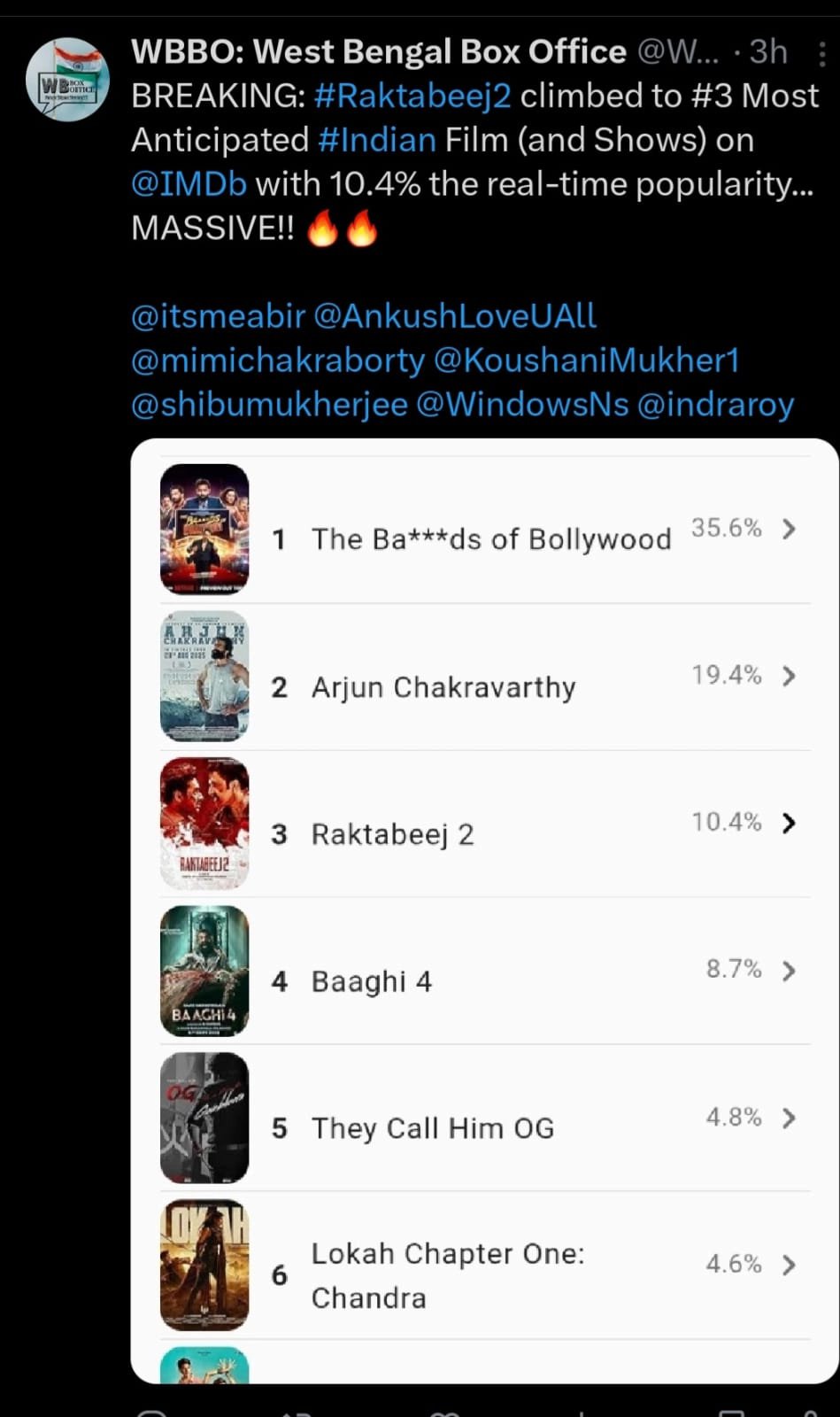 কিছুদিন আগেই মুক্তি পেয়েছে বহু প্রতীক্ষিত বাংলা ছবি ‘রক্তবীজ-২’-এর প্রথম ঝলক। হাতে আর মাত্র কয়েক দিন। ২৬ সেপ্টেম্বর মুক্তি পেতে চলেছে শিবপ্রসাদ মুখোপাধ্যায়-নন্দিতা রায় পরিচালিত ‘রক্তবীজ ২’। এবার এই ক'দিনের মধ্যেই দেশের বহু প্রতীক্ষিত ছবি-সিরিজের তালিকায় প্রথম তিনি উঠে এসেছে এই ছবি। অন্তত, তাই দেখাচ্ছে আইএমডিবি। এইমুহূর্তে সেই তালিকায় প্রথমে রয়েছে শাহরুখ-পুত্র আরিয়ান খান পরিচালিত প্রথম ওয়েব সিরিজ 'দ্য ব্যাডস অফ বলিউড'।