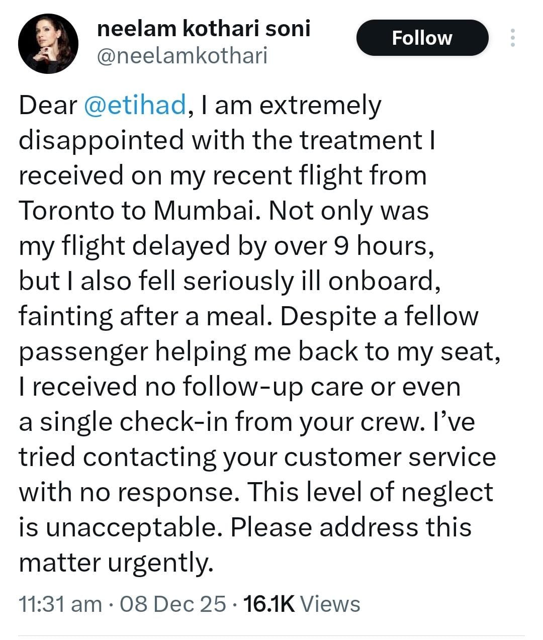তিনি এক্স-এ (পূর্বে টুইটার) লিখেছেন, ‘টরন্টো থেকে মুম্বই যাওয়ার ফ্লাইট শুধু ন’ঘণ্টা দেরি করল তা-ই নয়, মাঝ-আকাশে আমি গুরুতর অসুস্থ হয়ে পড়ি এবং খাবার দেওয়ার পরেই জ্ঞান হারাই। একজন যাত্রী আমাকে আমার আসনে ফিরতে সাহায্য করলেও, ক্রুর পক্ষ থেকে কোনও ধরনের খোঁজখবর নেওয়া হয়নি।’