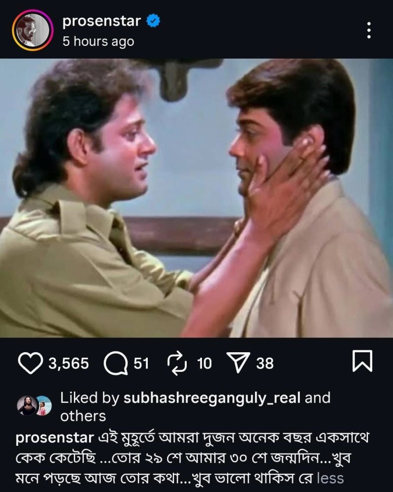 প্রয়াত জনপ্রিয় অভিনেতা-রাজনীতিবিদ তাপস পালের দারুণ সম্পর্ক ছিল প্রসেনজিতের। গতকাল অর্থাৎ ২৯ সেপ্টেম্বর ছিল তাপস পালের জন্মবার্ষিকী। ইন্ডাস্ট্রির অন্দরে কান পাতলে শোনা যেত, ২ জনের মধ্যে নাকি রেশারেশি রয়েছে। তবে খুব ঘনিষ্ঠদের সঙ্গে কথা বললে জানা যায়, সম্পর্কের সমীকরণ ছিল একেবারেই আলাদা। দুই নায়ক একে অপরকে ভীষণ স্নেহ করতেন। জন্মদিনে করা সেই পোস্টে যেন ফুটে উঠল সেই সম্পর্কের রসায়নের ঝলক। তাপস পাল নেই। আর তাঁর স্মৃতিতেই একটি পুরনো ছবি ভাগ করে নিলেন প্রসেনজিৎ চট্টোপাধ্যায়। ছবিটা একটি সিনেমার দৃশ্য। তাপস পাল, দুই হাতে ধরে রয়েছেন প্রসেনজিতের মুখ। ছবিটি শেয়ার করে প্রসেনজিৎ লিখেছেন, 'এই মুহূর্তে আমরা দুজন অনেক বছর একসঙ্গে কেক কেটেছি ...তোর ২৯ শে আমার ৩০ শে জন্মদিন...খুব মনে পড়ছে আজ তোর কথা...খুব ভাল থাকিস রে'। ১২টা বাজার সামান্য আগেই এই পোস্টটি করেছেন তিনি। অর্থাৎ, কখনও একসঙ্গে সেটে কাজ করতে করতে এই দিনটা এলে, তাঁরা ২ জনে এক কেক কেটে উদযাপন করতেন জন্মদিন।