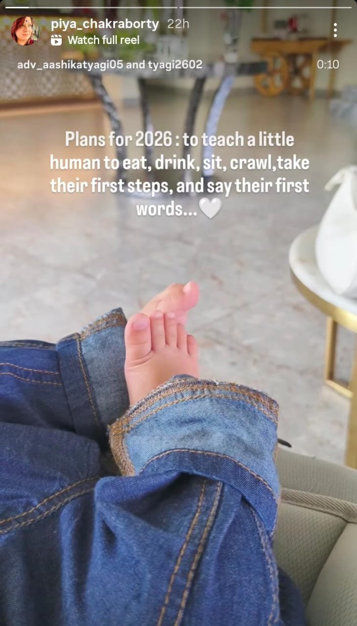 এদিন নিষাদ ওরফে নডির পায়ের একটি ভিডিও পোস্ট করেন তিনি ইনস্টাগ্রামের স্টোরিতে। সেখানেই একরত্তিকে জিন্স পরে পা দোলাতে দেখা যাচ্ছে। এই ভিডিওর সঙ্গে ক্যাপশনে পিয়া লেখেন, '২০২৬ সালের জন্য পরিকল্পনা: একটা ছোট্ট মানুষকে শেখানো যে কীভাবে খেতে হয়, বসতে হয়, হামা দিতে হয়, ছোট ছোট পা ফেলে হাঁটতে হয়, এবং প্রথম বুলি বলতে হয়।'