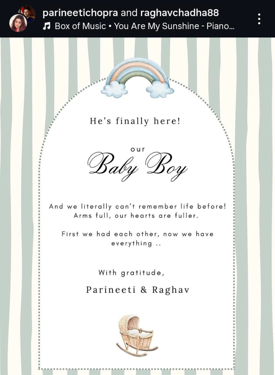 মা হলেন পরিণীতি চোপড়া। রাঘব চাড্ডা ও পরিণীতির কোল আলো করে এল পুত্র সন্তান। মা হওয়ার খবর সমাজমাধ্যমে কয়েক মাস আগেই ভাগ করেছিলেন অভিনেত্রী। এবার সন্তান জন্মের খবরও জানিয়ে দিলেন এই তারকা জুটি।
