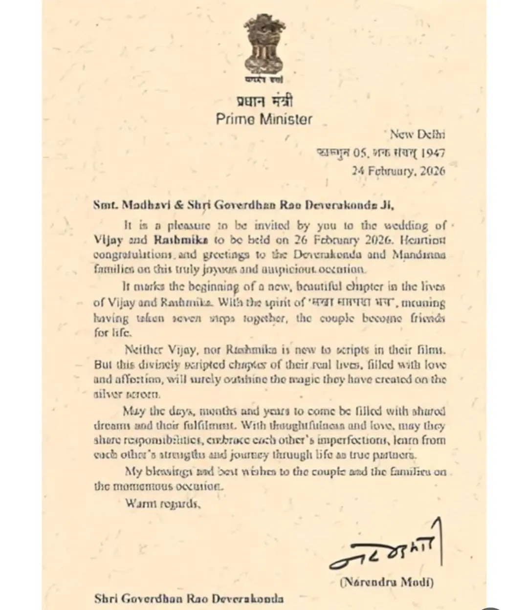 রশ্মিকা এবং বিজয়কে নরেন্দ্র মোদী যে চিঠি পাঠিয়েছেন বিয়ের শুভেচ্ছা জানিয়ে সেটা সম্প্রতি সোশ্যাল মিডিয়ায় ভাইরাল হয়েছে। এই চিঠিটি যদিও তিনি তারকা যুগলকে উদ্দেশ্য করে নয়, বরং অভিনেতার মা বাবাকে উদ্দেশ্য করে লেখা হয়েছে।