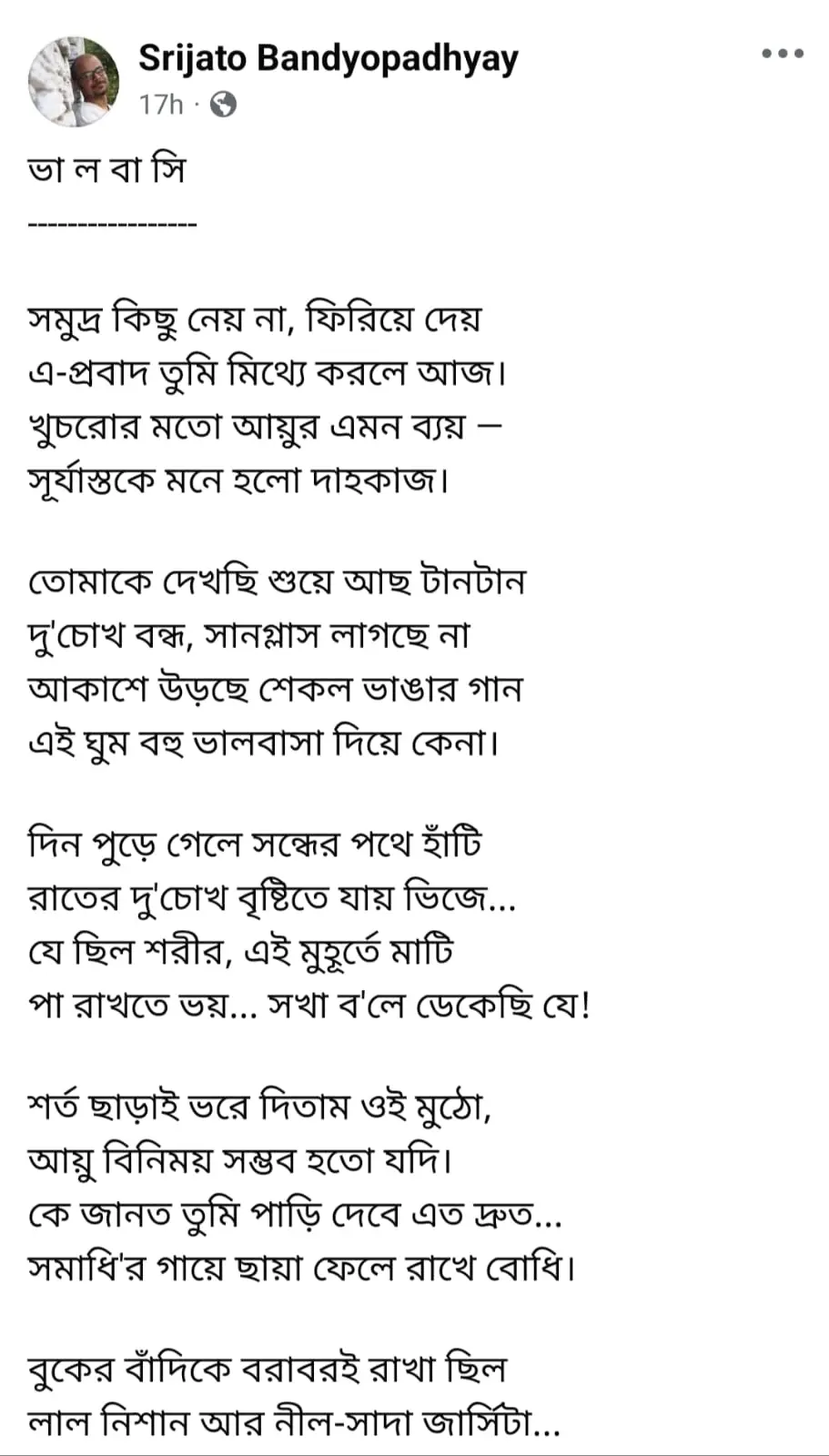 মঙ্গলবার বিকেলে এক বিষণ্ণ গোধূলিতে কেওড়াতলা মহাশ্মশানে চিরনিদ্রায় শায়িত হলেন অভিনেতা রাহুল অরুণোদয় বন্দ্যোপাধ্যায়। গ্ল্যামার দুনিয়ার কোনও চাকচিক্য নয়, বরং নিজের আজন্ম লালিত রাজনৈতিক আদর্শ এবং সাধারণ মানুষের ভালবাসায় সিক্ত হয়েই বিদায় নিলেন বিজয়গড়ের ‘বাবিন’। সেই শোকের আবহে যখন গোটা শহর জুড়ে কেবলই হাহাকার, তখন প্রিয় বন্ধুর বিদায়ে কলম ধরলেন কবি শ্রীজাত। তাঁর যন্ত্রণাসিক্ত গভীর ভালবাসার প্রতিটি অক্ষর এখন সমাজমাধ্যমে এক একটি দীর্ঘশ্বাস হয়ে ঘুরছে। আর আগুনের মতো ছড়িয়ে পড়ল শ্রীজাতর সেই কবিতা। নাম— ‘ভালবাসি’।