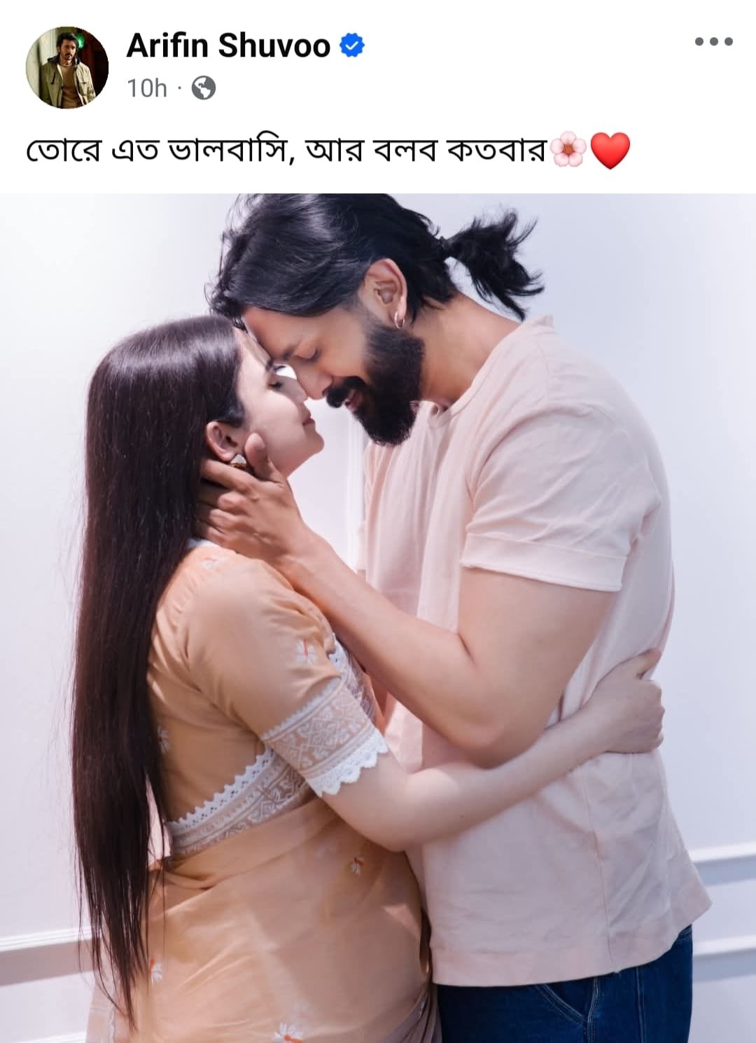 এই পোস্টের মাধ্যমে অনুরাগী মহলে উত্তেজনা ছড়িয়ে দিলেন আরিফিন শুভ। হৃদয়ের ইমোজিসহ নিজেদের একটি প্রেমময় ছবি প্রকাশ করলেন নিজের দেয়ালে। তার উপরে ক্যাপশন জুড়েছেন, ‘তোরে এত ভালোবাসি, আর বলবো কতবার’। তবে কি সত্যি সত্যি ঐশীর প্রেমে ডুব দিলেন শুভ? অন্যদিকে ঐশী যেন সেই কথারই প্রতিধ্বনি হয়ে লিখলেন, ‘যদি হারাস একটিবার, মরে যাব শতবার।’