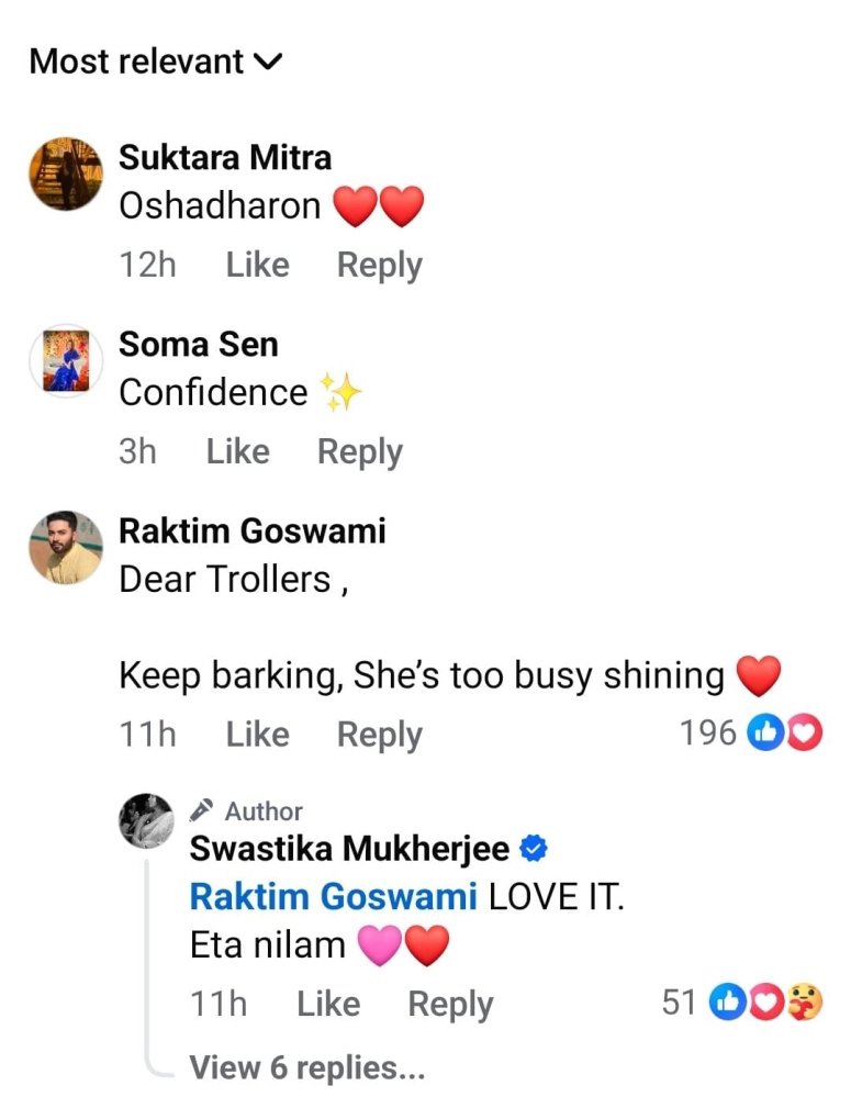 সম্প্রতি একটি রিলে তাঁকে “জোকার” বলে কটাক্ষ করেছিলেন এক নেটনাগরিক। কিন্তু অভিনেত্রীর জবাব ছিল ঠোঁটকাটা— “আমি আর এদের ট্রল বলে সম্মান দিই না। এরা আমার খোরাক, আমার স্ট্রেসবাস্টার। আমিই ওদের কাছ থেকে এন্টারটেইনমেন্ট পাই।এরকম চরম লেভেলের এন্টারটেইনমেন্ট আর কোথাও পাওয়া যায়না। মানুষ আমাদের এন্টারটেনার বলে থাকে, আমি ভাই এদের কাছে ডাহা ফেল। ”
