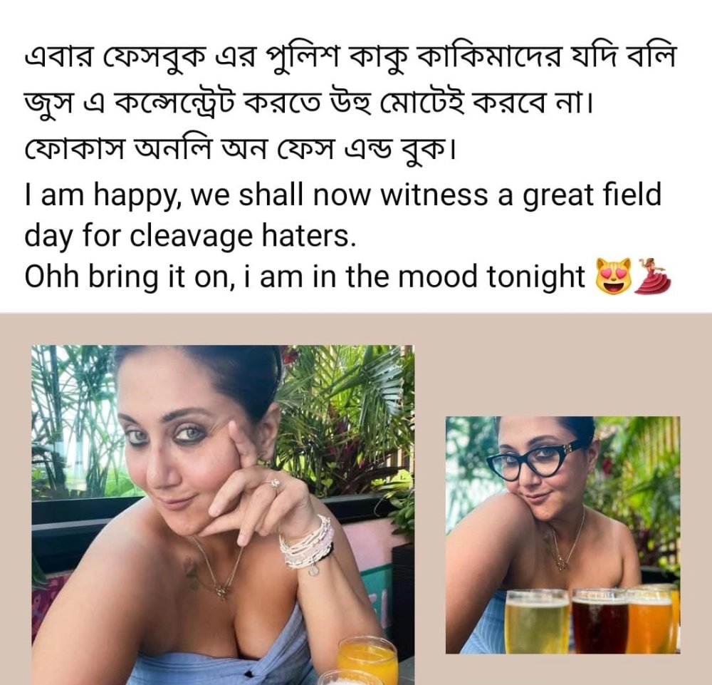 কিন্তু পোস্টের আসল টুইস্ট অন্যত্র। লিখলেন, “যতই বলি জুস নিয়ে ফোকাস করো, ফেসবুকের পুলিশ কাকু-কাকিমারা ফোকাস করবেন শুধু ফেস আর বুক নিয়েই। তাই বলি, বক্ষবিভাজিকার হেটাররা তৈরি থাকুন, আমি আজ পুরো মুডে আছি।”