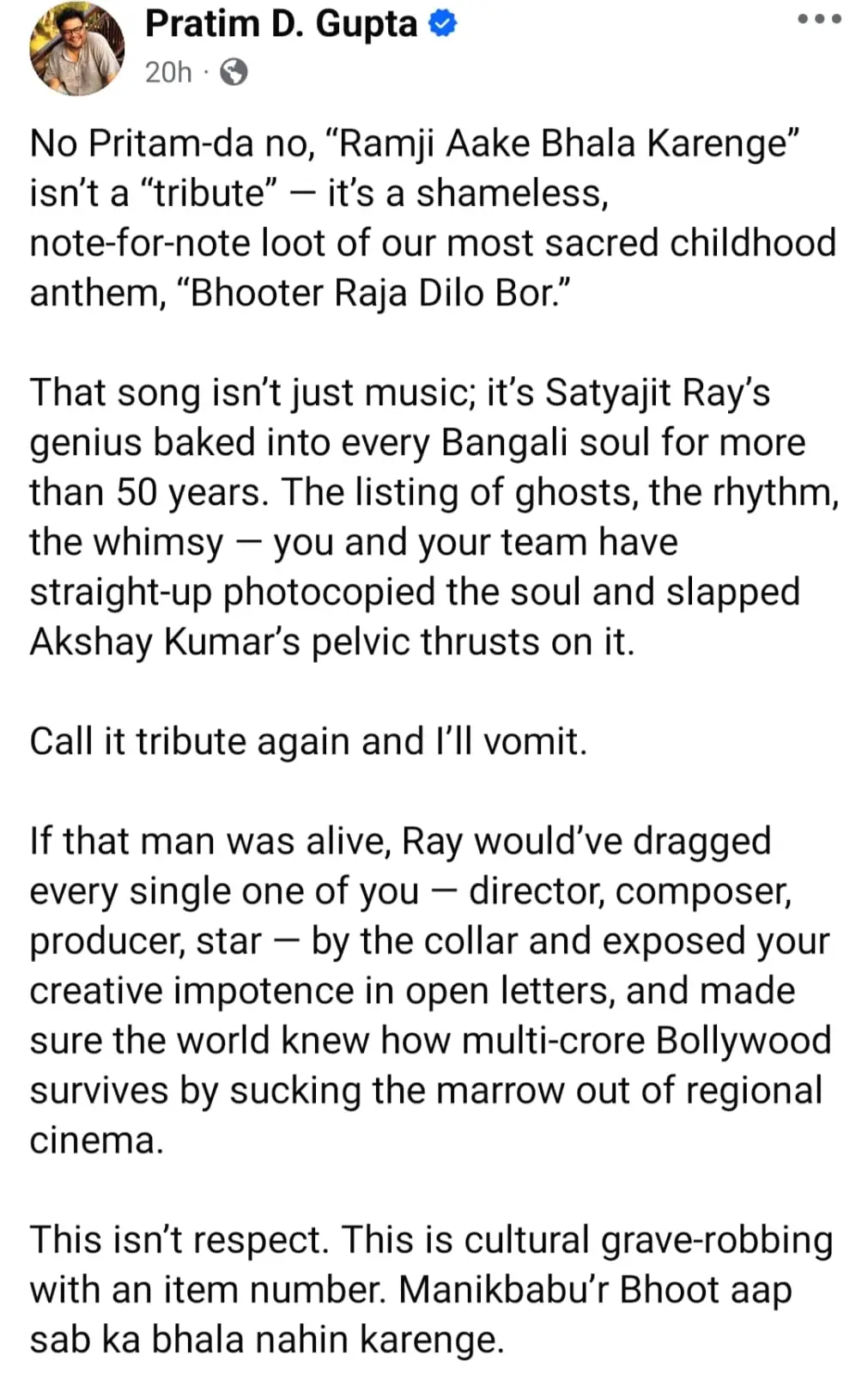 ফেসবুক পোস্টে প্রতীম ডি গুপ্ত কার্যত ক্ষোভ উগরে দিয়ে লিখেছেন, “না প্রীতমদা, ‘রাম জি আকে ভলা করেনগে’ কোনও ‘ট্রিবিউট’ নয়। এটা আমাদের শৈশবের সবচেয়ে পবিত্র গানগুলোর একটি—‘ভূতের রাজা দিল বর’-এর নির্লজ্জ, নোটে-নোটে লুঠ।”