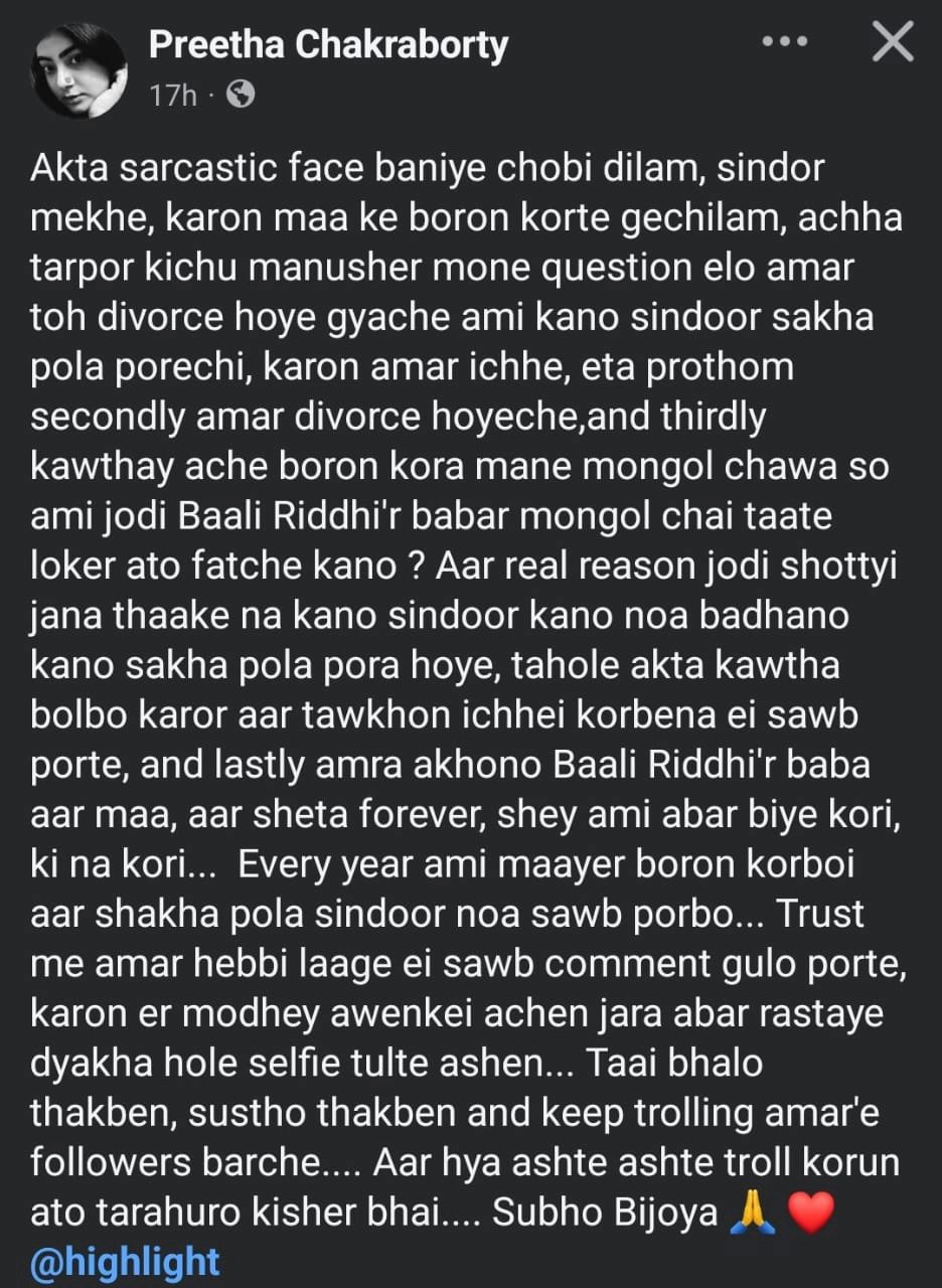 পৃথা লেখেন,'দ্বিতীয়ত, আমার ডিভোর্স হয়েছে। এবং তৃতীয়ত, কথায় আছে বরণ করা মানে মঙ্গল চাওয়া। তাই, আমি যদি বালি ও ঋদ্ধির বাবার মঙ্গল চাই! আর আসল কারণ যদি সত্যি জানা থাকে না কেন সিঁদুর, কেন নোয়া বাঁধন, কেন শাখা, পলা পরা হয়, তাহলে একটা কথা বলব—কারওর আর তখন ইচ্ছেই করবে না এই সব পরতে। এবং শেষ কথা হল, আমরা এখনও বালি ও ঋদ্ধির বাবা আর মা, আর সেটা চিরকালের জন্য। সে আমি আবার বিয়ে করি, কী না করি... প্রতি বছর আমি মায়ের বরণ করবই আর শাখা, পলা, সিঁদুর, নোয়া সব পরব...।'