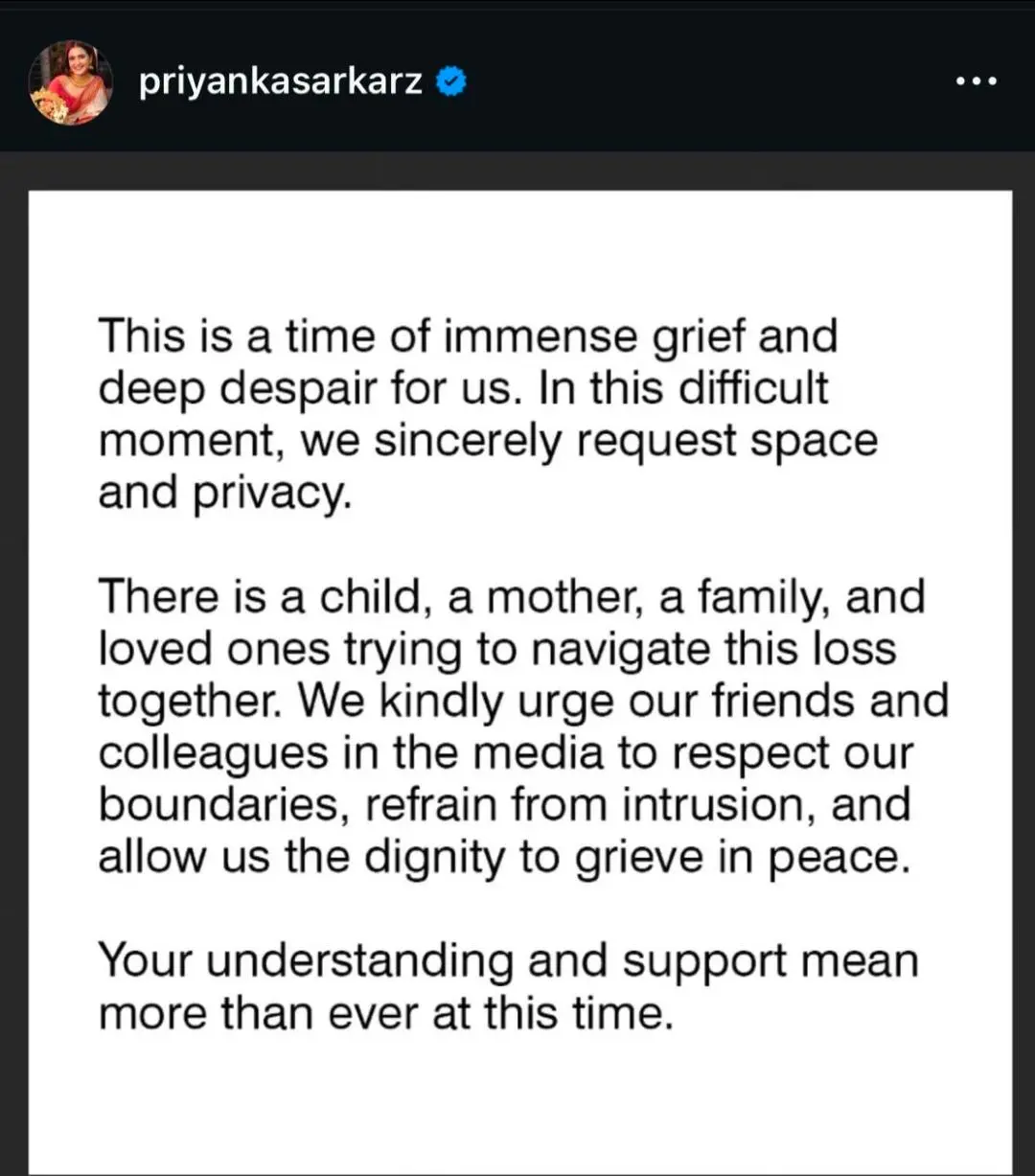 সমাজমাধ্যমে এদিন প্রিয়াঙ্কা লেখেন, "এই সময়টা অত্যন্ত শোকের, আমাদের জন্য দারুণ হতাশার। এই কঠিন সময়, আমরা প্রাইভেসি চাইছি।" তিনি এদিন তাঁর ইনস্টাগ্রাম পোস্টে আরও লেখেন, "একজন সন্তান, একজন মা, একটা পরিবার এবং প্রিয়জনেরা একসঙ্গে এই বড় ক্ষতির মোকাবিলা করার চেষ্টা করছি। আমরা আমাদের বন্ধু, সহকর্মী এবং মিডিয়াকে অনুরোধ করব সীমা মেনে চলার। আমাদের একান্তে শোক পালন করতে দিন। আশা করব আপনারা এটা বুঝবেন। আপনাদের সহযোগিতা এই সময় একান্ত কাম্য।"