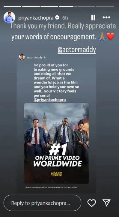 অভিনেতার কথায়, “কী দারুণ অভিনয়! তুমি একেবারে নিজের জায়গাটা তৈরি করেছ।” এই প্রশংসার জবাবে প্রিয়াঙ্কাও ইনস্টাগ্রাম স্টোরিতে মাধবনের পোস্ট শেয়ার করে লেখেন, “ধন্যবাদ বন্ধু… তোমার উৎসাহভরা কথাগুলো সত্যিই অনেকটা মানে রাখে।” সঙ্গে জুড়লেন একটি নমস্কার ভঙ্গির হাত আর লাল হৃদয়ের ইমোজি।'হেডস অফ স্টেট' ছবিতে প্রিয়াঙ্কা হলেন এমআই ৬ (MI6) এজেন্ট নোয়েল বিসে। ছবিতে আমেরিকার প্রেসিডেন্ট হিসেবে জন সিনা এবং ব্রিটিশ প্রধানমন্ত্রী হিসেবে ইদ্রিস এলবা—এই দুই চরিত্রের জুটি, বিশ্ববিপর্যয় থামাতে মরিয়া। পরিচালক ইলিয়া নাইশুলার। আবেগময় এই আন্তরিক মুহূর্তে বলিউড আর হলিউড যেন একসুতোয় বাঁধা  পড়েছে।