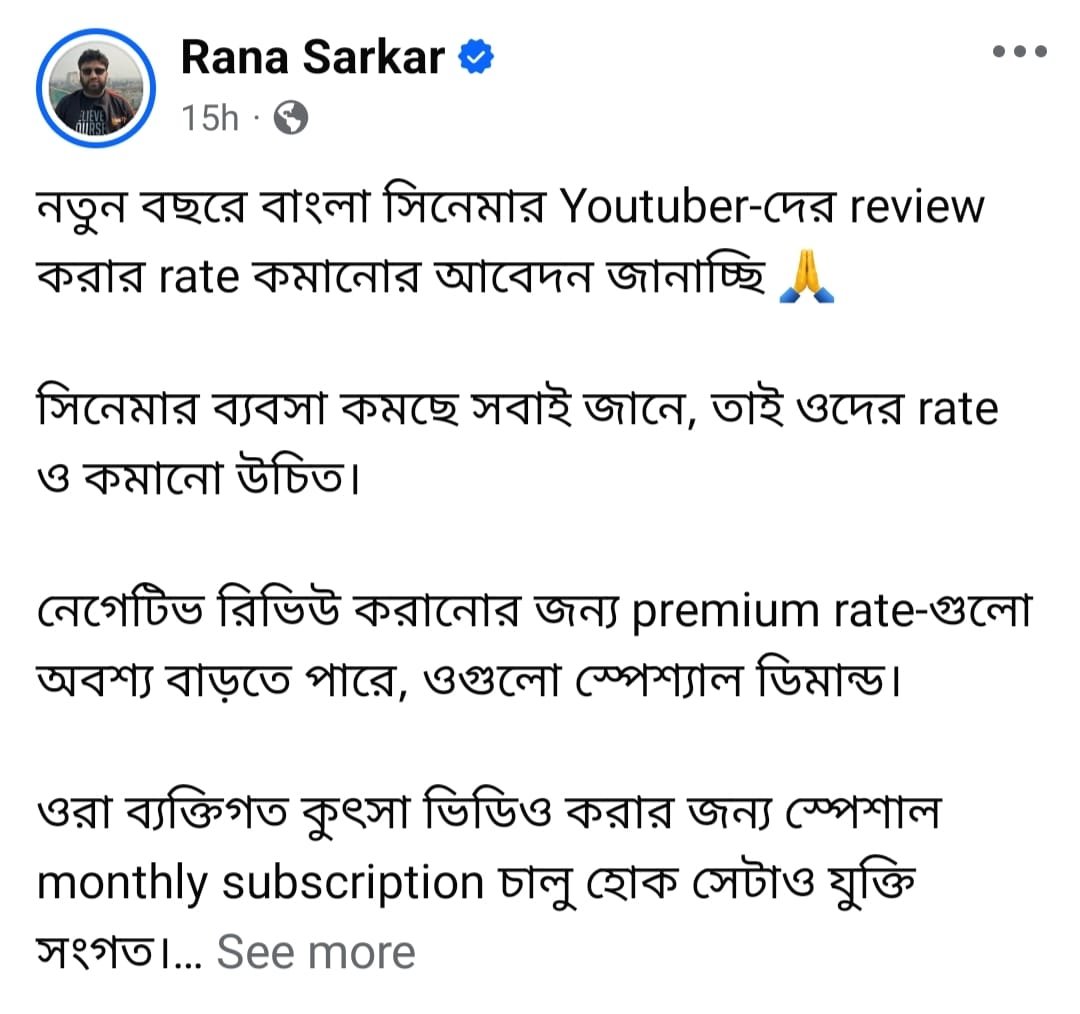 তিনি লিখলেন, “নতুন বছরে বাংলা সিনেমার Youtuber-দের review করার rate কমানোর আবেদন জানাচ্ছি