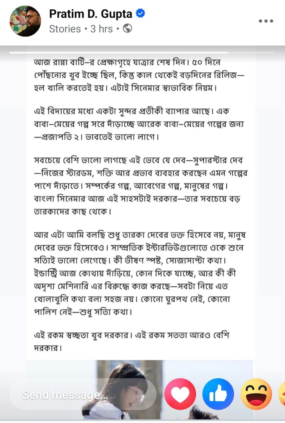 সবচেয়ে বেশি ভালো লাগছে এই ভেবে যে দেব—সুপারস্টার দেব—নিজের স্টারডম, শক্তি আর প্রভাব ব্যবহার করছেন এমন গল্পের পাশে দাঁড়াতে। সম্পর্কের গল্প, আবেগের গল্প, মানুষের গল্প। বাংলা সিনেমার আজ এই সাহসটাই দরকার—তার সবচেয়ে বড় তারকাদের কাছ থেকে।