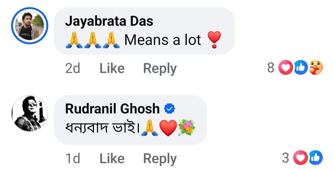 ঋদ্ধির এই পোস্টের বার্তা বাক্সে তাঁকে 'ভাই' ডেকে ধন্যবাদ জানিয়েছেন রুদ্রনীল। সঙ্গে জুড়ে দিয়েছেন লাল হৃদয়ের ইমোজি।