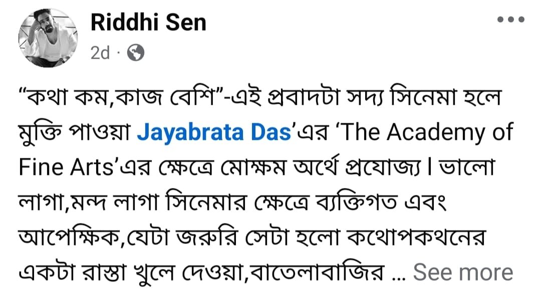 ফেসবুকে ঋদ্ধি লিখলেন, “কথা কম, কাজ বেশি”-এই প্রবাদটা সদ্য সিনেমা হলে মুক্তি পাওয়া Jayabrata Das’এর ‘The Academy of Fine Arts’এর ক্ষেত্রে মোক্ষম অর্থে প্রযোজ্য l ভালো লাগা,মন্দ লাগা সিনেমার ক্ষেত্রে ব্যক্তিগত এবং আপেক্ষিক,যেটা জরুরি সেটা হলো কথোপকথনের একটা রাস্তা খুলে দেওয়া,বাতেলাবাজির ফাইন আর্টসের বাংলা বাজারে জয়ব্রত দাস কাজ করেছে পরিশ্রম করে, প্রমোশনের গিমিক আর ফ্লপের সাকসেস উদযাপন করার জন্য পার্টিতে যাওয়া পরিচালকদের এবার নতুন করে ভাবার সময়ে এসে গেছে,একজন নবাগত পরিচালক কোনো বড় প্রযোজনা সংস্থার চোখের মণি না হয়েও হাউসফুল দিতে পারে স্রেফ পরিশ্রম আর সৎ প্রচেষ্টার জন্য, ছবির ভালো দিক,মন্দ দিক নিয়ে আলোচনা চলবে, মতবিরোধ,মতান্তর থাকবেই এবং সেটাই সুস্থতার লক্ষণ, কিন্তু এই মুহূর্তে যেটা সবার আগে প্রয়োজন সেটা হলো বাংলা চলচ্চিত্র জগতের নিজেদের অলস হাওয়ায় ফোলানো বেলুনটাকে ফাটিয়ে ফেলা,পিনের কাজটা The Academy of Fine Arts করতে অনেকটা সক্ষম হয়েছে l মগজের মেদ ঝরানোর জন্য সিনিয়ররা এবার একটু জিমে যান l