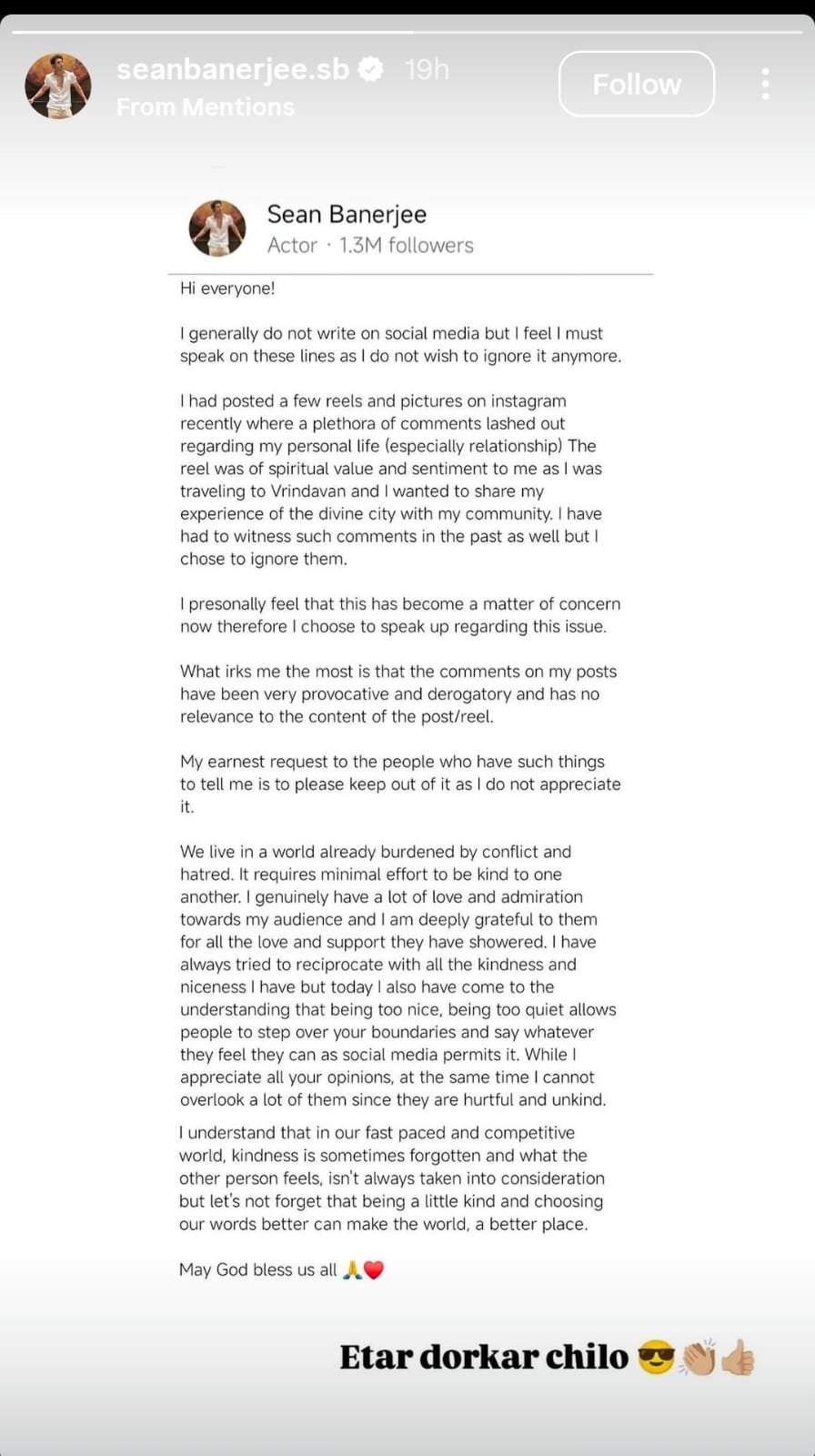 এই ঘটনার পরই এদিন সোশ্যাল মিডিয়া শন তাঁর নিজের মতামত তুলে ধরেন। সেই বিবৃতিতে 'রোশনাই' খ্যাত অভিনেতা লেখেন, 'আমি সাধারণত সোশ্যাল মিডিয়ায় কিছু লিখি না, কিন্তু এখন মনে হচ্ছে বিষয়টা আর এড়ানো ঠিক হবে না। এটা নিয়ে কথা বলা উচিত। আমি ইনস্টাগ্রামে বেশ কিছু ছবি এবং রিল পোস্ট করেছিলাম, তারপরই যেভাবে নোংরা মন্তব্য করা হল আমার ব্যক্তিগত জীবন, বিশেষ করে প্রেম জীবন নিয়ে...। আমি বৃন্দাবন গিয়েছিলাম, আর আমার সেই অভিজ্ঞতাই সকলের সঙ্গে ভাগ করে নিতে চেয়েছিলাম। আমি আগেও এই ধরনের মন্তব্য পেয়েছিলাম, কিন্তু এড়িয়ে গিয়েছিলাম।'