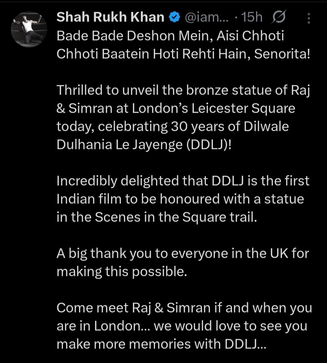 মূর্তি উন্মোচনের মুহূর্তের ছবি পোস্ট করে এক্স-এ একটি পোস্ট করেছেন শাহরুখ নিজেও। বাদশা লিখলেন, “লন্ডনের লেইস্টার স্ক্যোয়ারে রাজ-সিমরনের ব্রোঞ্জের মূর্তি উদ্বোধন করতে পেরে যারপরনাই উত্তেজিত। ‘দিলওয়ালে দুলহানিয়া লে জায়েঙ্গে’ ছবির ৩০ বছরের পূর্তি এভাবেই উদ্যাপন করা হল...ইউনাইটেড কিংডমের প্রত্যেককে ধন্যবাদ যাঁরা এই ব্যাপারটি সম্ভব করলেন।