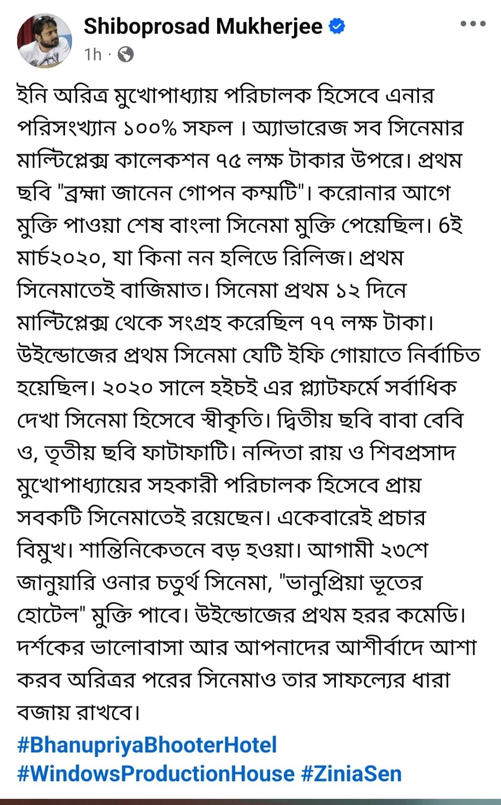 এই ছবির সঙ্গেই শিবপ্রসাদ লিখলেন, “ইনি অরিত্র মুখোপাধ্যায় পরিচালক হিসেবে এনার পরিসংখ্যান ১০০% সফল । অ্যাভারেজ সব সিনেমার মাল্টিপ্লেক্স কালেকশন ৭৫ লক্ষ টাকার উপরে। প্রথম ছবি "ব্রহ্মা জানেন গোপন কম্মটি"। করোনার আগে মুক্তি পাওয়া শেষ বাংলা সিনেমা মুক্তি পেয়েছিল। ৬ই মার্চ২০২০, যা কিনা নন হলিডে রিলিজ। প্রথম সিনেমাতেই বাজিমাত। সিনেমা প্রথম ১২ দিনে মাল্টিপ্লেক্স থেকে সংগ্রহ করেছিল ৭৭ লক্ষ টাকা। উইন্ডোজের প্রথম সিনেমা যেটি ইফি গোয়াতে নির্বাচিত হয়েছিল। ২০২০ সালে হইচই এর প্ল্যাটফর্মে সর্বাধিক দেখা সিনেমা হিসেবে স্বীকৃতি। দ্বিতীয় ছবি বাবা বেবি ও, তৃতীয় ছবি ফাটাফাটি। নন্দিতা রায় ও শিবপ্রসাদ মুখোপাধ্যায়ের সহকারী পরিচালক হিসেবে প্রায় সবকটি সিনেমাতেই রয়েছেন। একেবারেই প্রচার বিমুখ। শান্তিনিকেতনে বড় হওয়া। আগামী ২৩শে জানুয়ারি ওনার চতুর্থ সিনেমা, ‘ভানুপ্রিয়া ভূতের হোটেল’ মুক্তি পাবে। উইন্ডোজের প্রথম হরর কমেডি। দর্শকের ভালোবাসা আর আপনাদের আশীর্বাদে আশা করব অরিত্রর পরের সিনেমাও তার সাফল্যের ধারা বজায় রাখবে।”