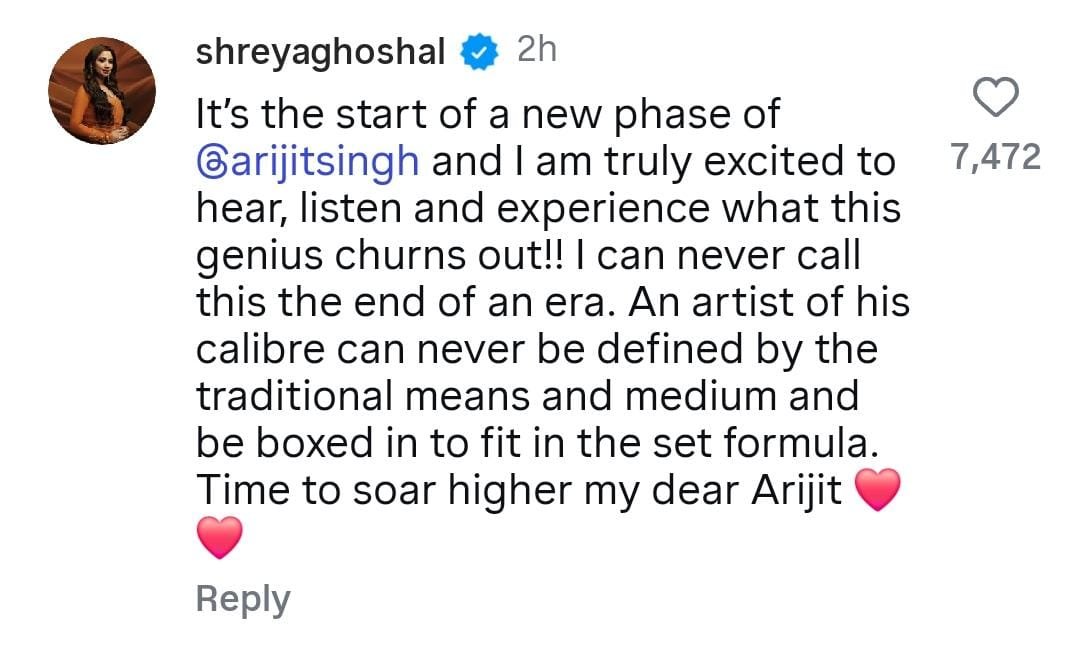 অরিজিতের শিল্পীসত্তার প্রশংসা করে শ্রেয়া আরও লেখেন, ‘আমি একে কোনও যুগের অবসান বলতে পারি না। অরিজিতের মতো শিল্পীকে কখনওই প্রচলিত সংজ্ঞায় বেঁধে রাখা যায় না। এবার আরও উঁচুতে ওড়ার সময়, প্রিয় অরিজিৎ।’