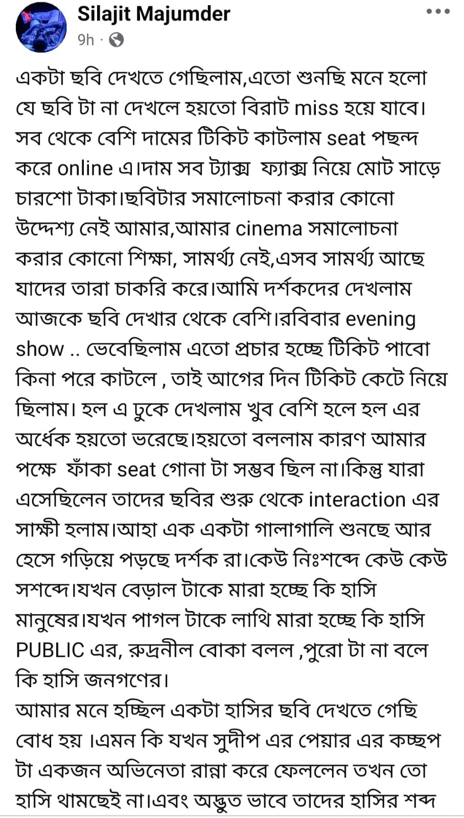 ফেসবুকে শিলাজিৎ লিখেছেন, “একটা ছবি দেখতে গেছিলাম, এতো শুনছি মনে হলো যে ছবি টা না দেখলে হয়তো বিরাট miss হয়ে যাবে।সব থেকে বেশি দামের টিকিট কাটলাম seat পছন্দ করে online এ।দাম সব ট্যাক্স ফ্যাক্স নিয়ে মোট সাড়ে চারশো টাকা।ছবিটার সমালোচনা করার কোনো উদ্দেশ্য নেই আমার,আমার cinema সমালোচনা করার কোনো শিক্ষা, সামর্থ্য নেই,এসব সামর্থ্য আছে যাদের তারা চাকরি করে।আমি দর্শকদের দেখলাম আজকে ছবি দেখার থেকে বেশি।রবিবার evening show .. ভেবেছিলাম এতো প্রচার হচ্ছে টিকিট পাবো কিনা পরে কাটলে , তাই আগের দিন টিকিট কেটে নিয়ে ছিলাম। হল এ ঢুকে দেখলাম খুব বেশি হলে হল এর অর্ধেক হয়তো ভরেছে।হয়তো বললাম কারণ আমার পক্ষে ফাঁকা seat গোনা টা সম্ভব ছিল না।কিন্তু যারা এসেছিলেন তাদের ছবির শুরু থেকে interaction এর সাক্ষী হলাম।আহা এক একটা গালাগালি শুনছে আর হেসে গড়িয়ে পড়ছে দর্শক রা।কেউ নিঃশব্দে কেউ কেউ সশব্দে।যখন বেড়াল টাকে মারা হচ্ছে কি হাসি মানুষের।যখন পাগল টাকে লাথি মারা হচ্ছে কি হাসি PUBLIC এর, রুদ্রনীল বোকা বলল, পুরো টা না বলে কি হাসি জনগণের।